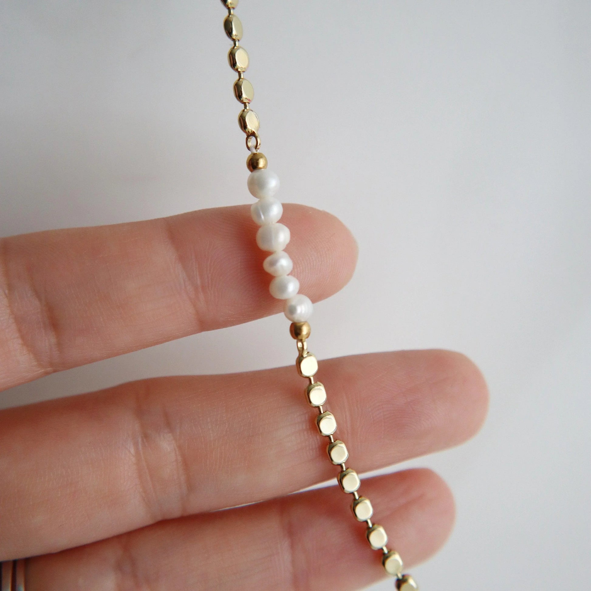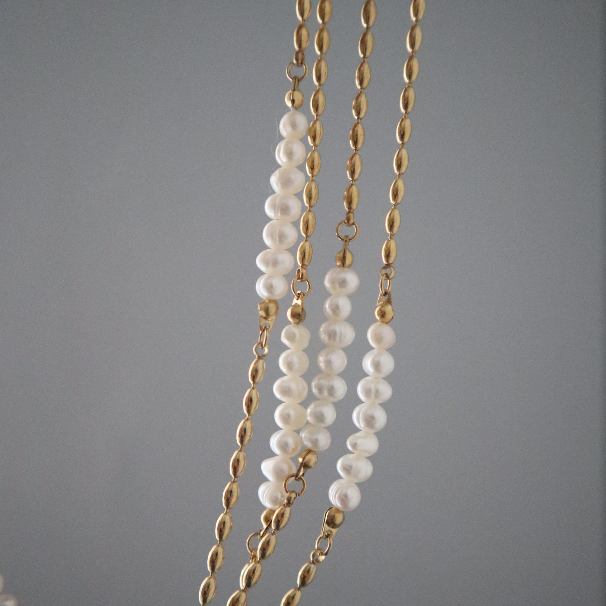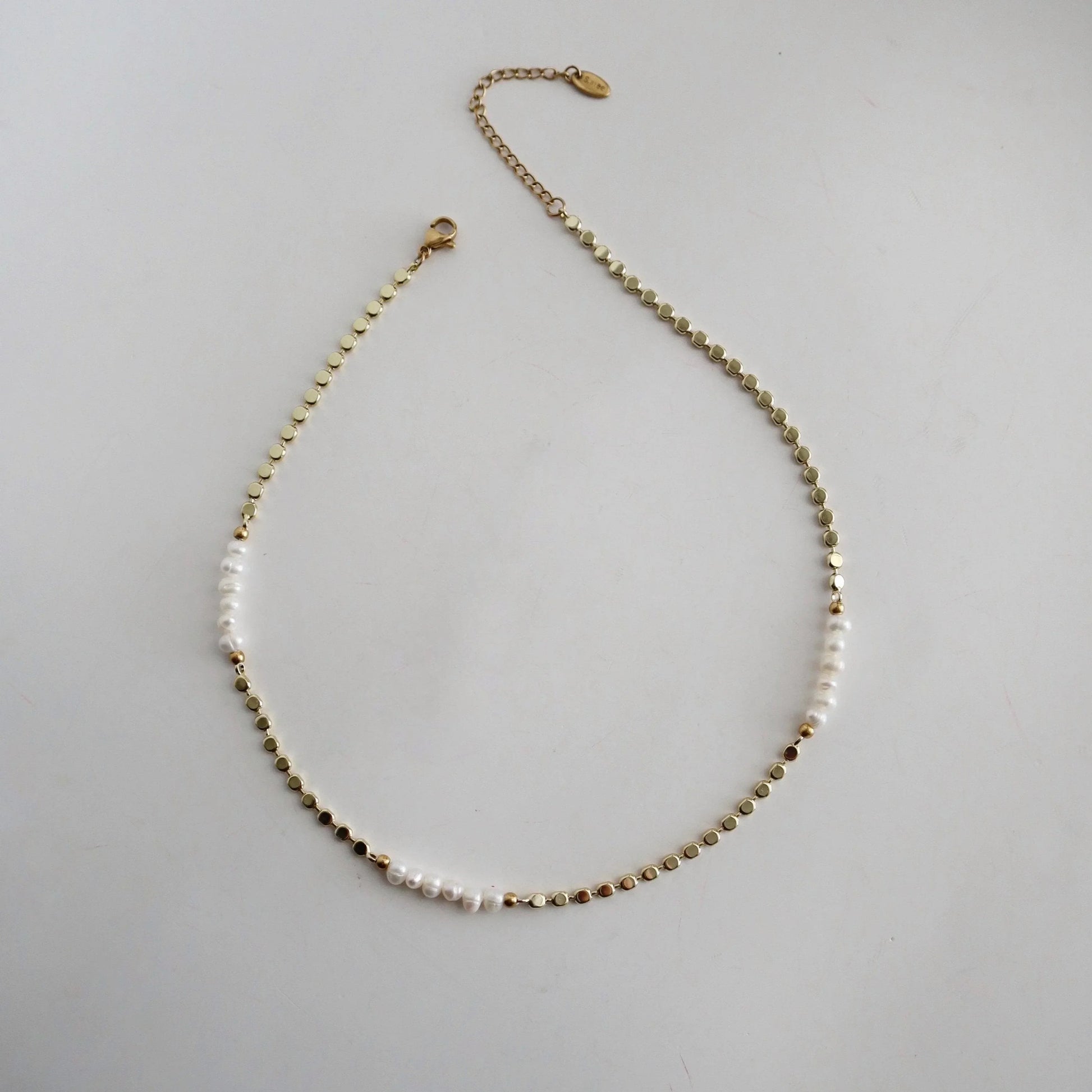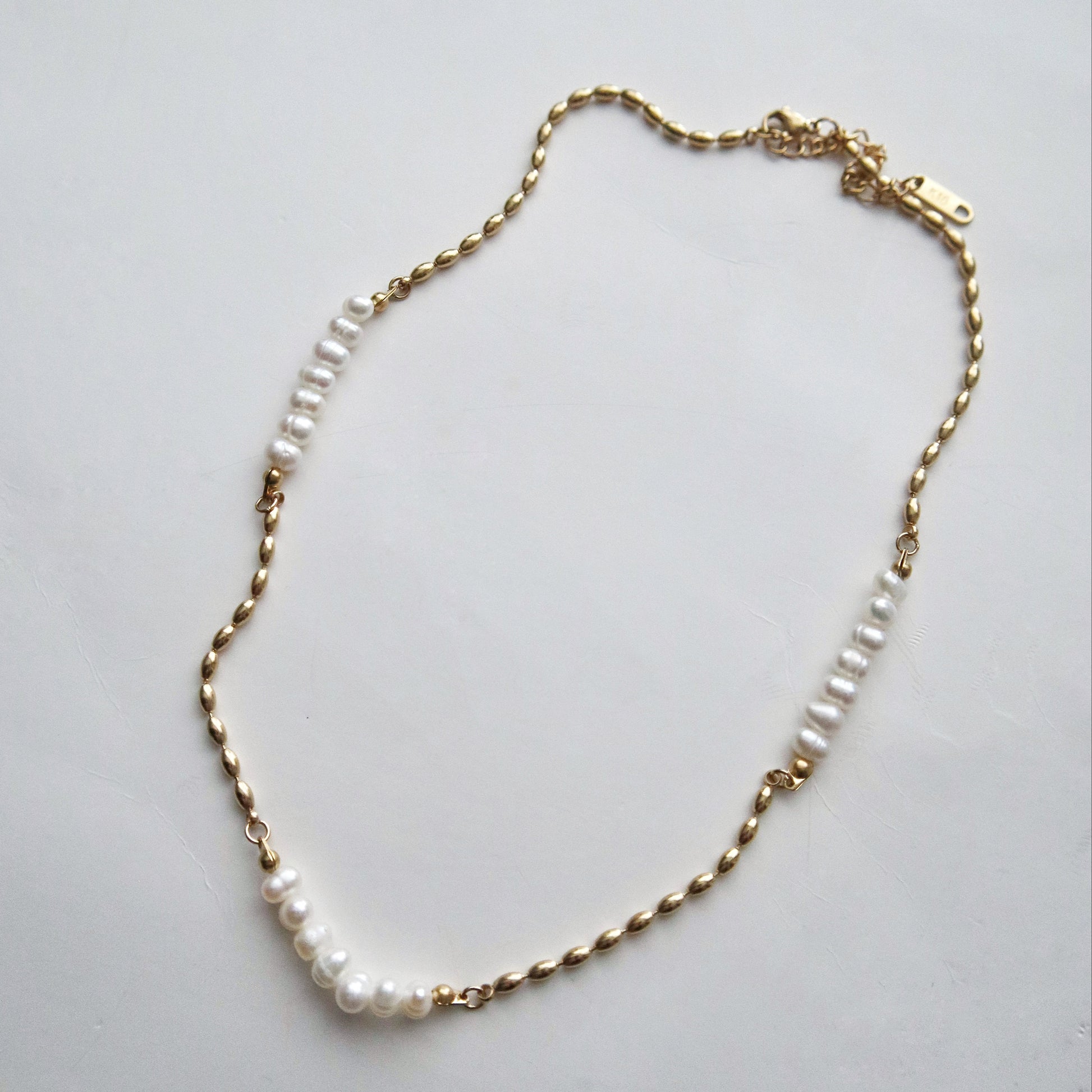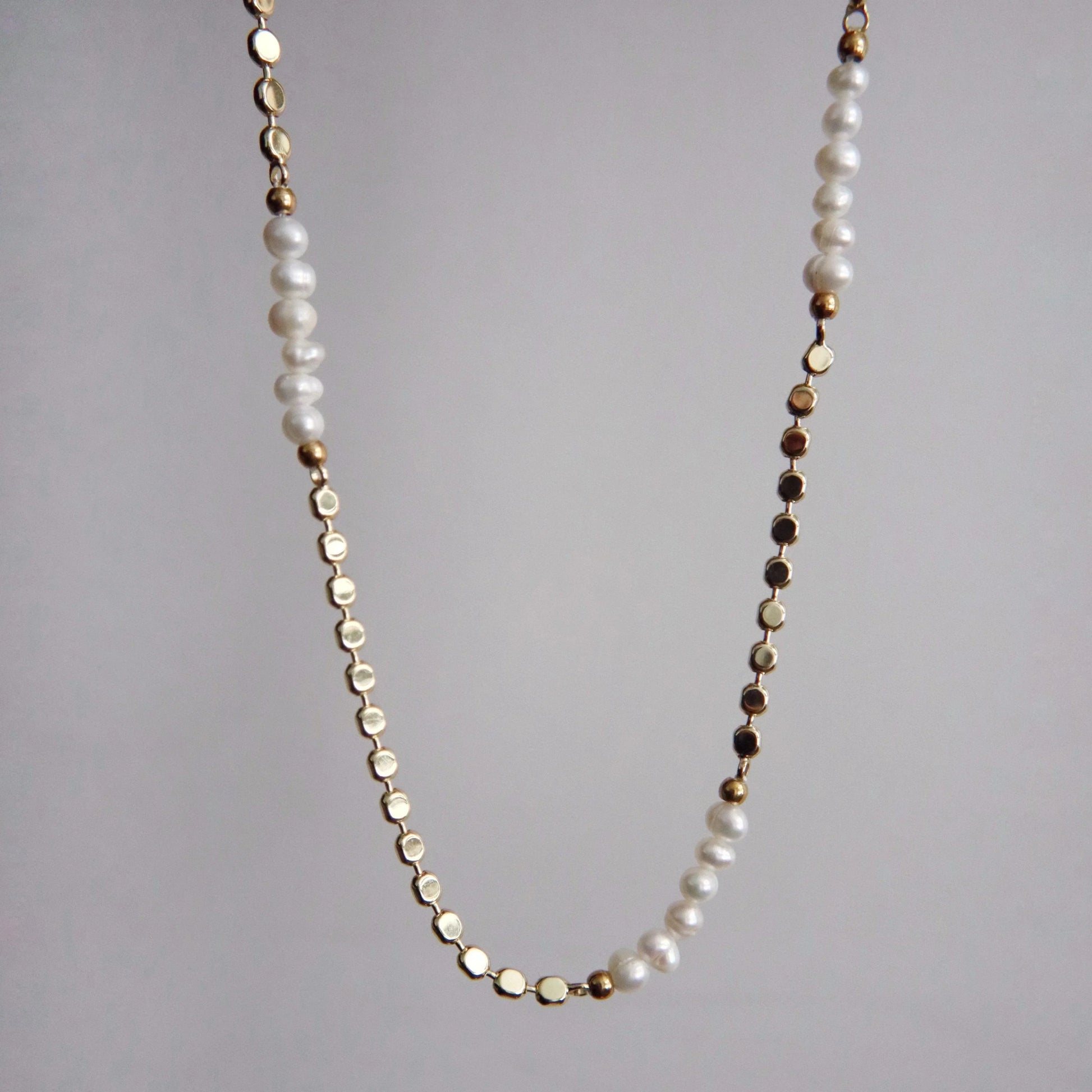 This elegant necklace combines the timeless beauty of pearls with the modern edge of a sleek gold plated chain. The alternating sections of lustrous pearls and high-shine gold links create a delicate balance of classic and contemporary design. Perfect for layering or wearing solo for a minimalist statement.