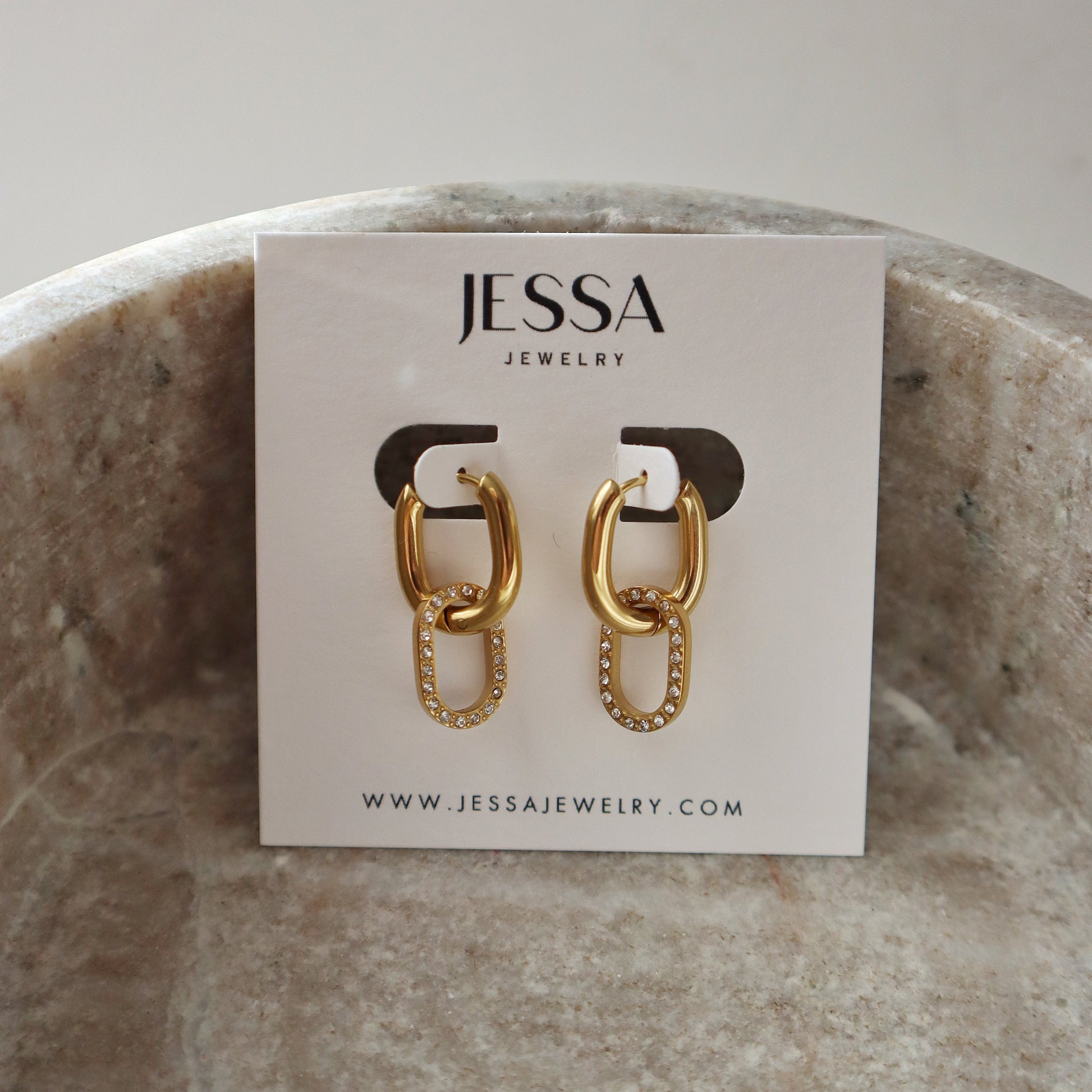 The Arabella Hoops feature a double hoop design - a minimalist top hoop with a dangling second hoop accented with CZ stones. Lightweight and eye-catching, it’s the perfect balance of modern edge and subtle glam.