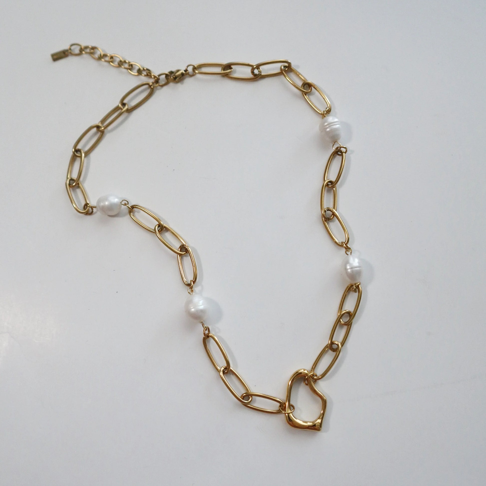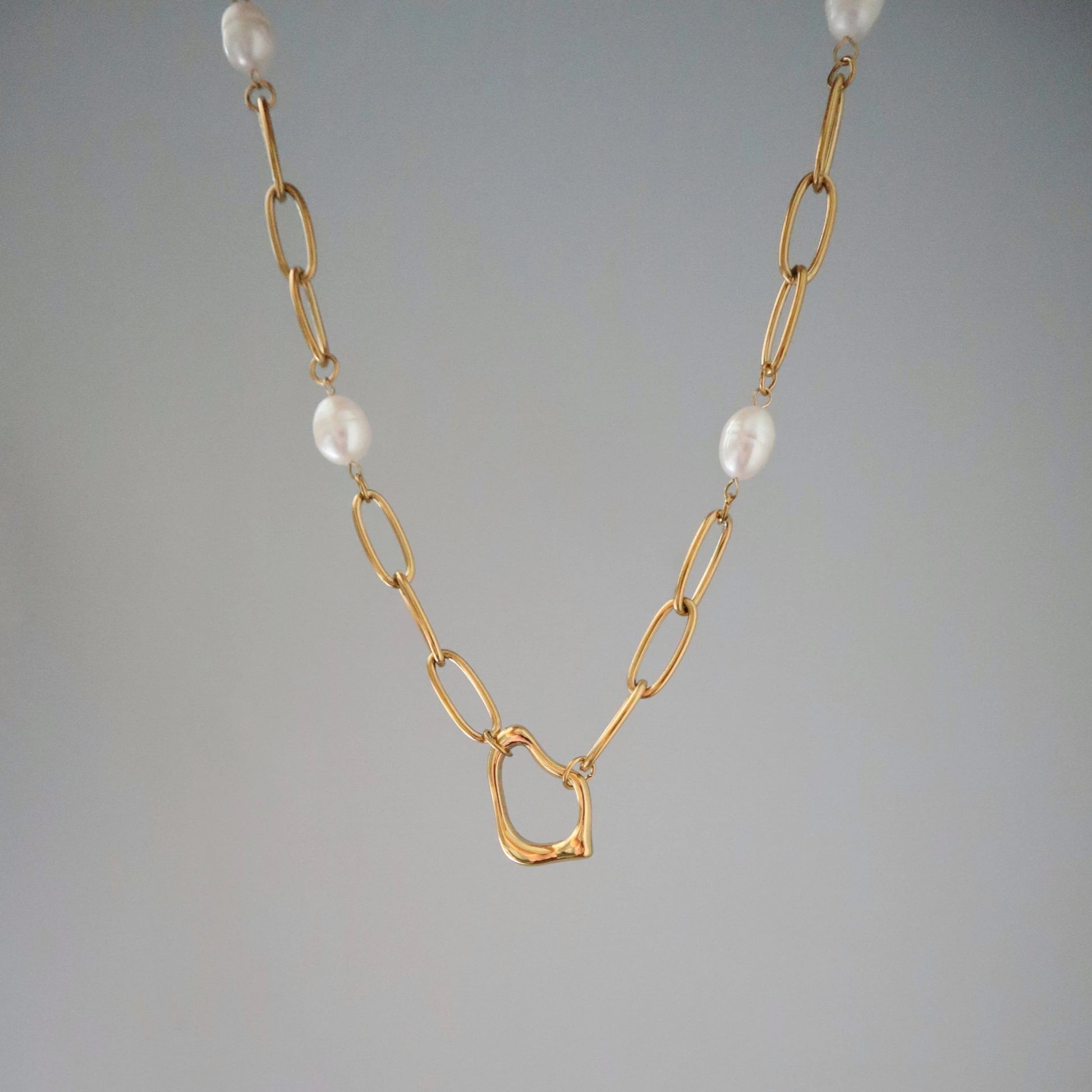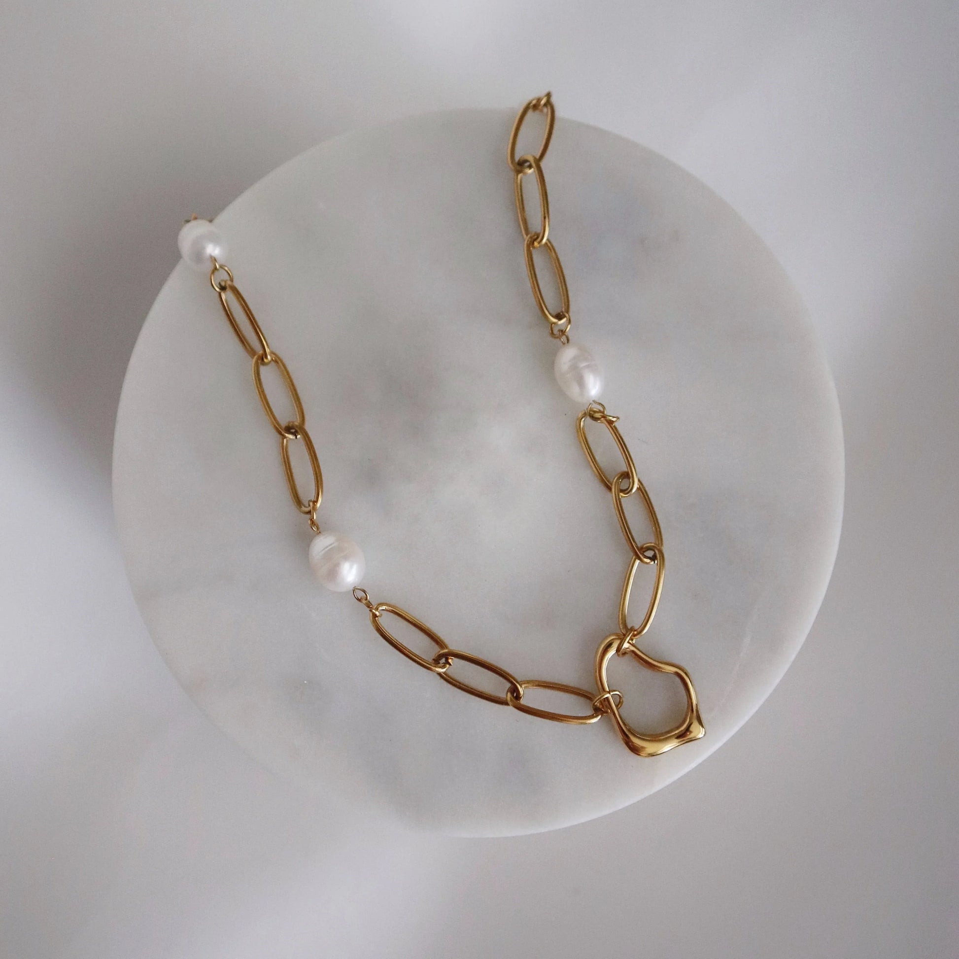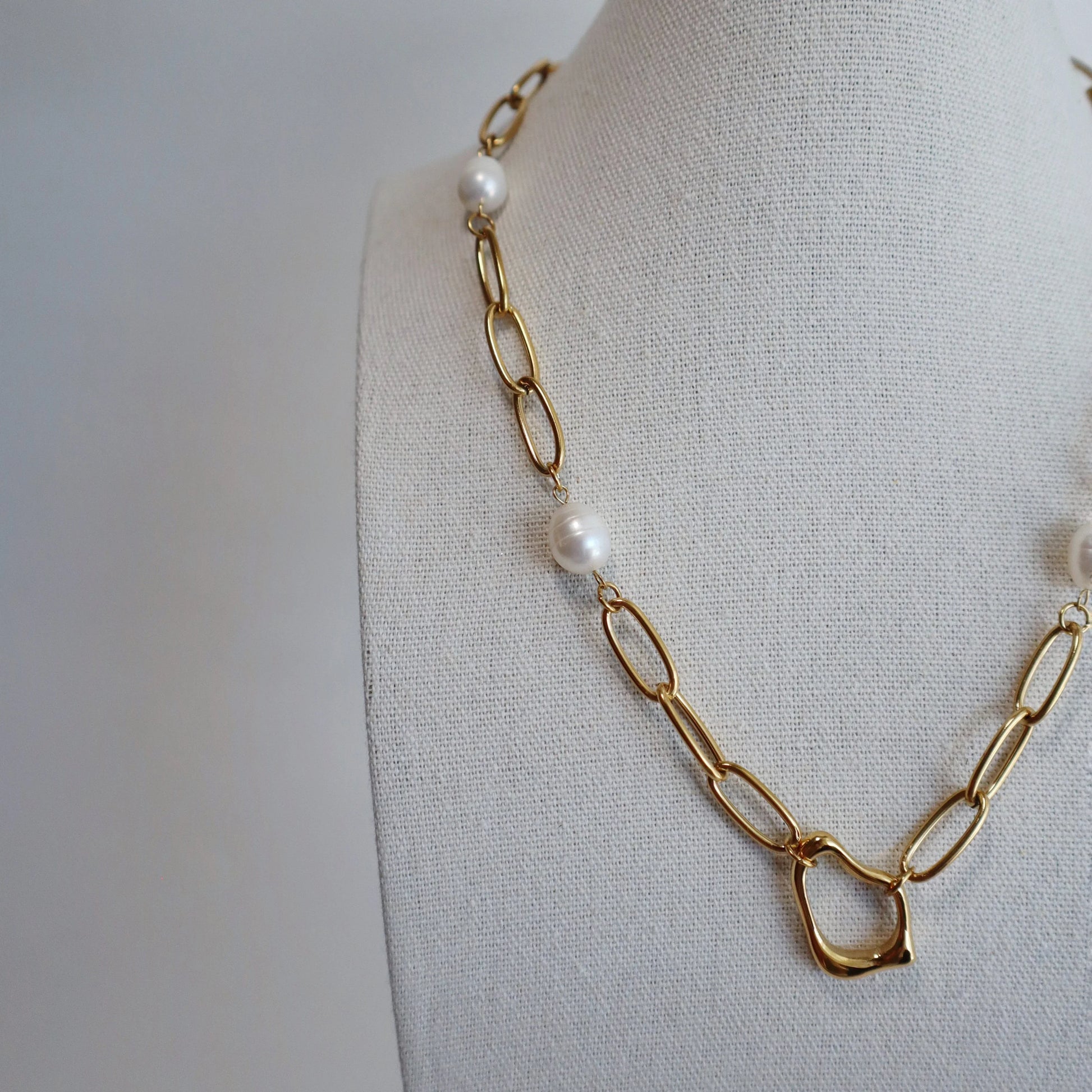 Bold meets graceful in this stunning link necklace, featuring a modern mix of oversized chain links and pearls. Whether worn alone or layered, this necklace adds chicness to any outfit.