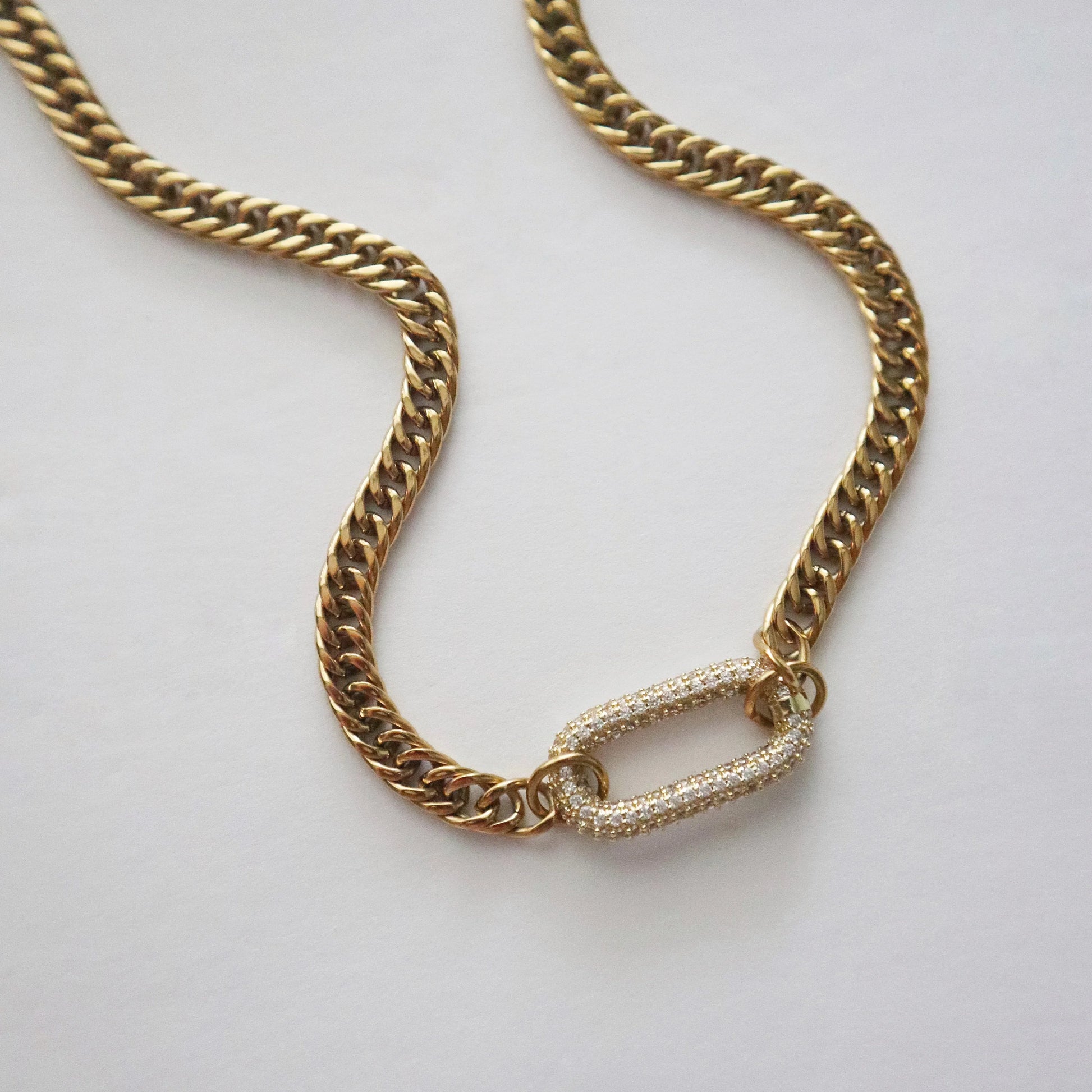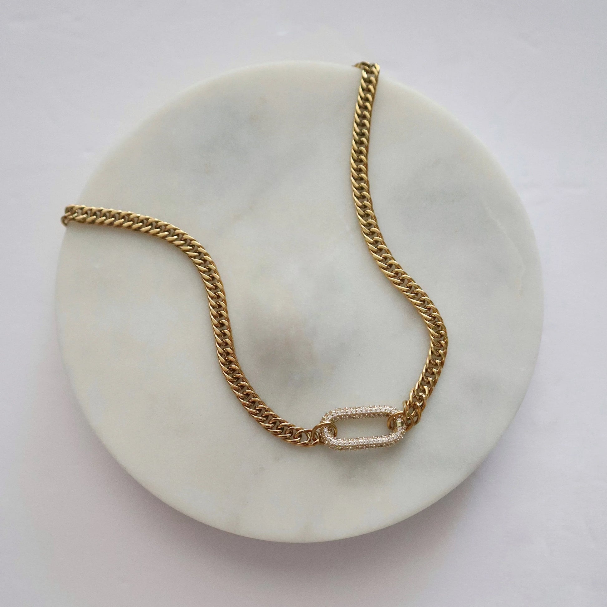 Turn heads with the Blake Pave Link Chain Choker, featuring a bold chain and a pave link. This fun choker is perfect for making a stylish statement wherever you go.