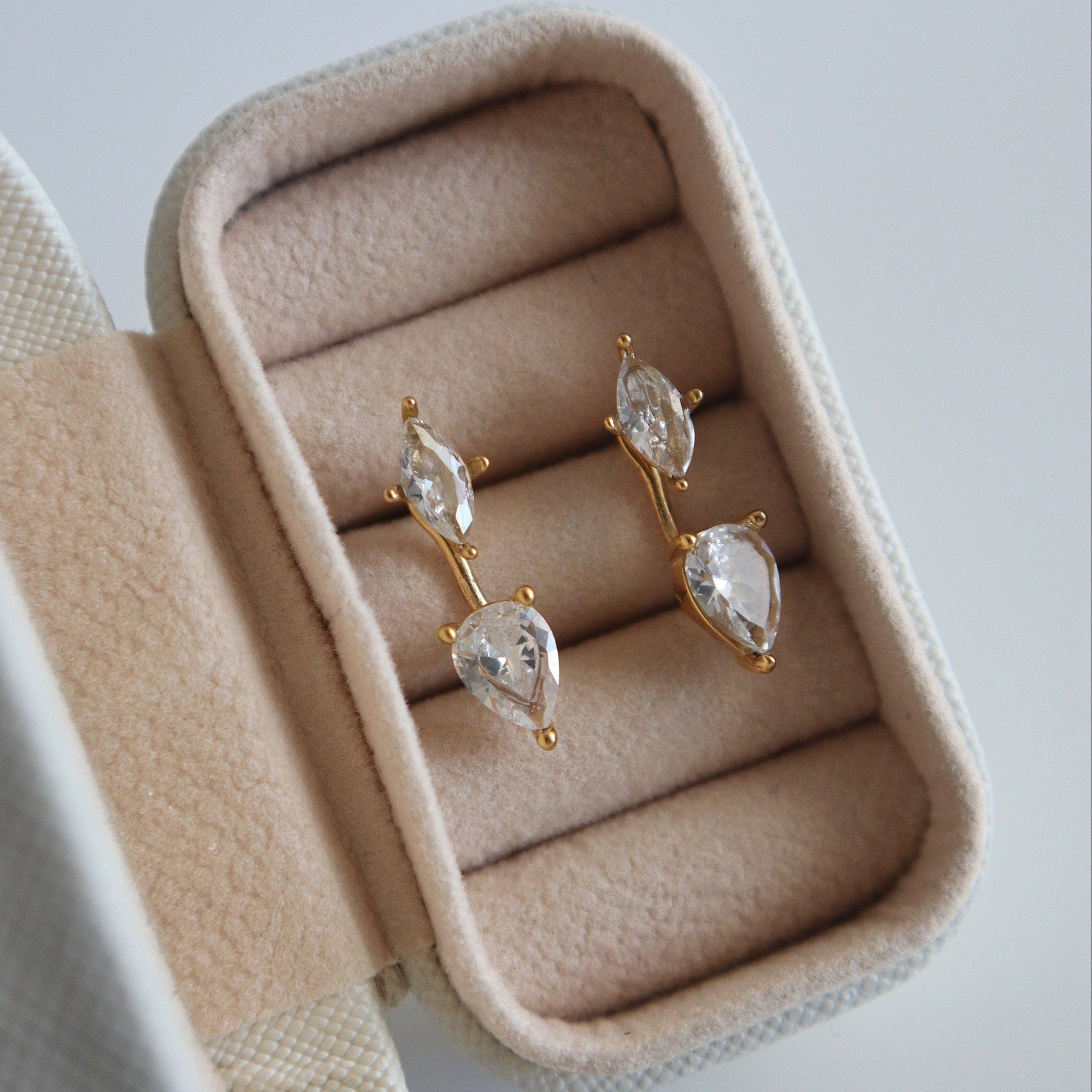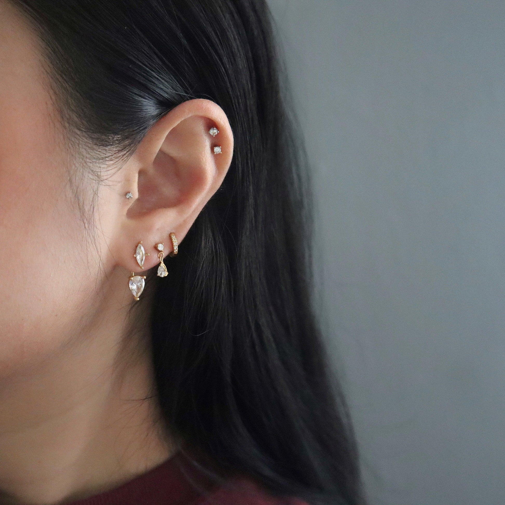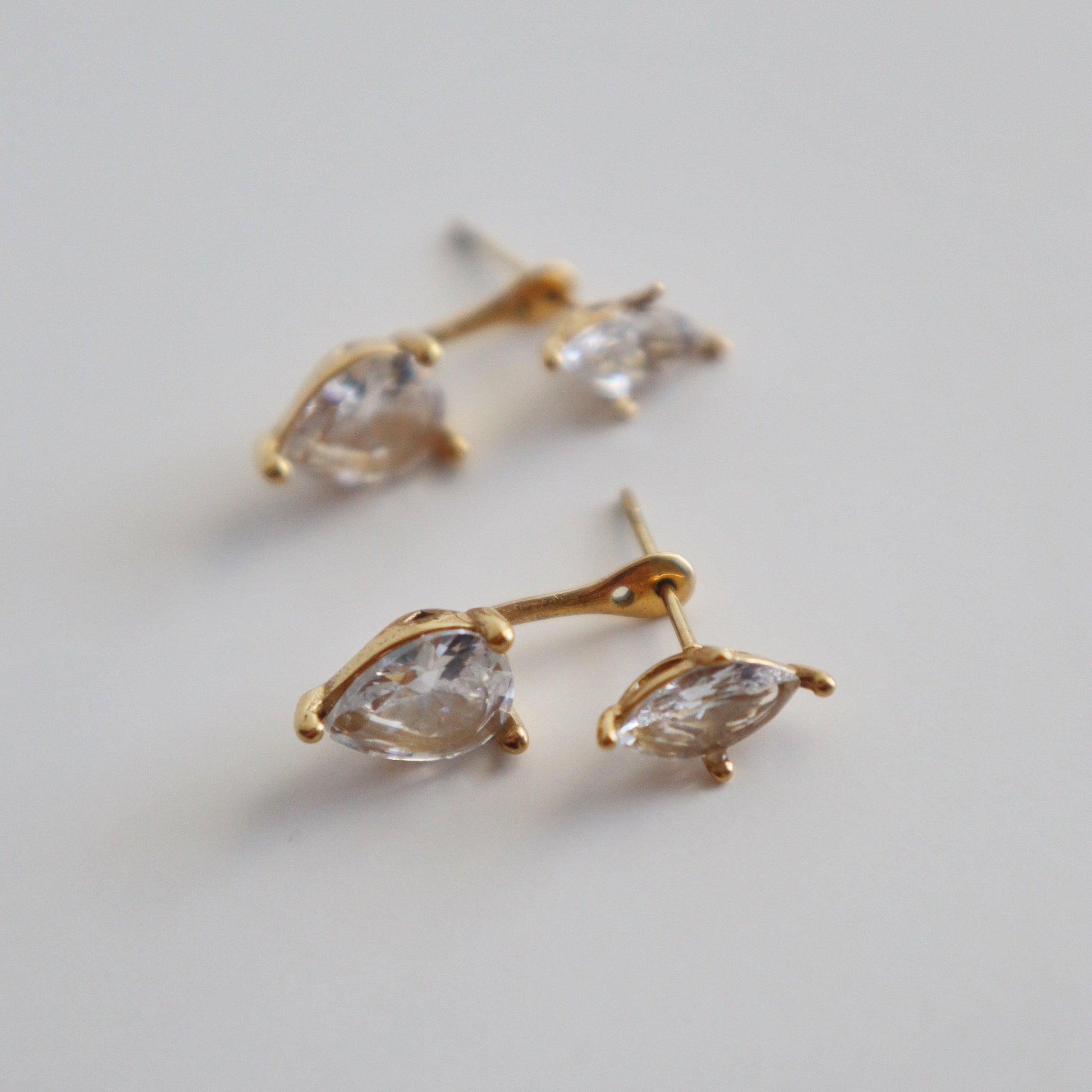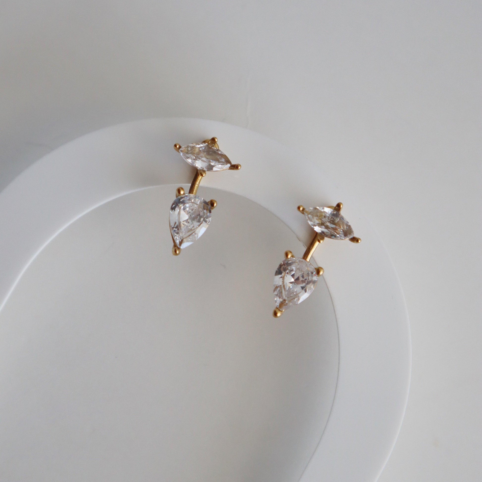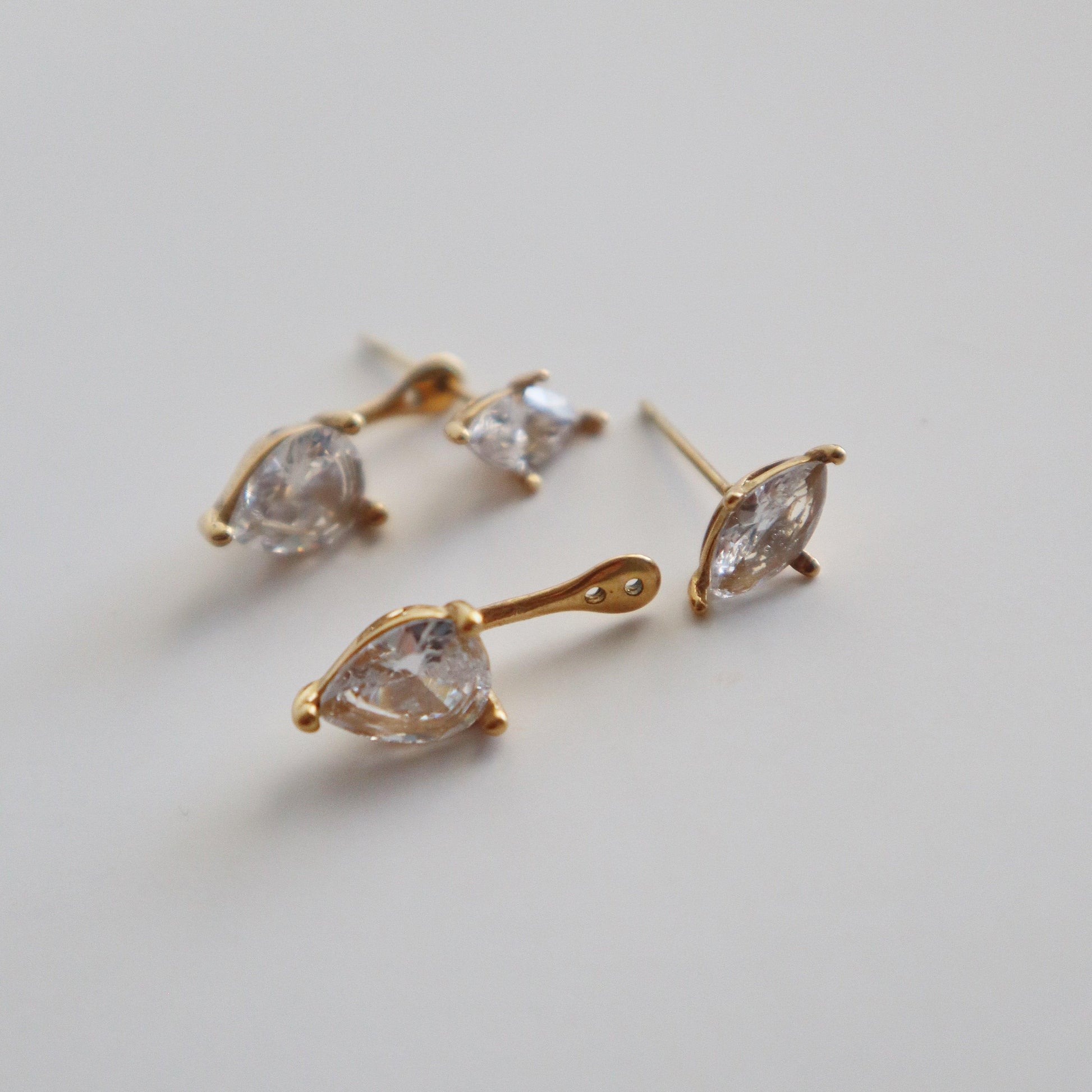 This versatile two-in-one earring features a sleek marquise shaped stud with an attachable drop. You can wear it as a chic single stud for a more subtle and minimalist look or add the attachable drop for a stunning, elongated look. Perfect for any occasion, this earring offers effortless elegance.