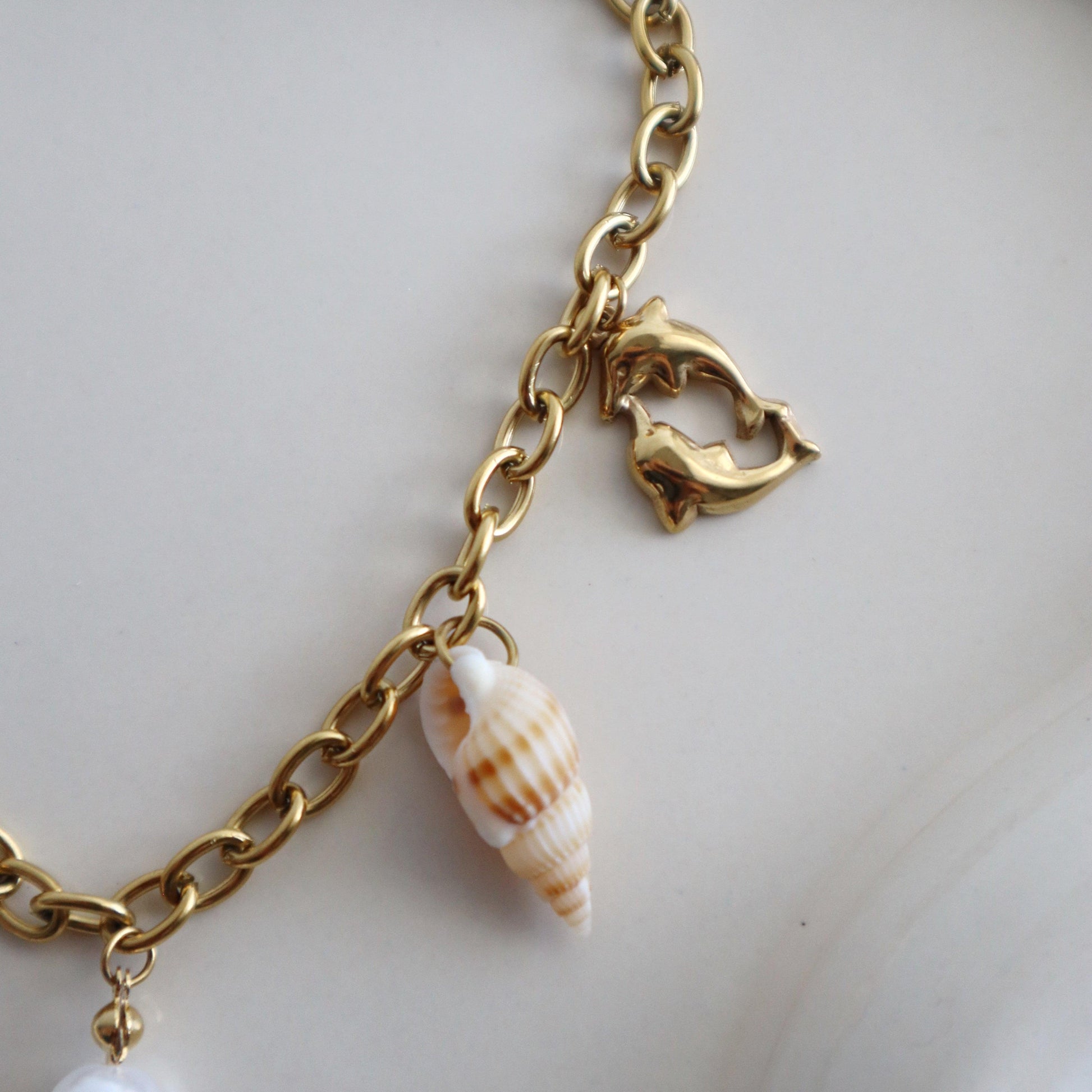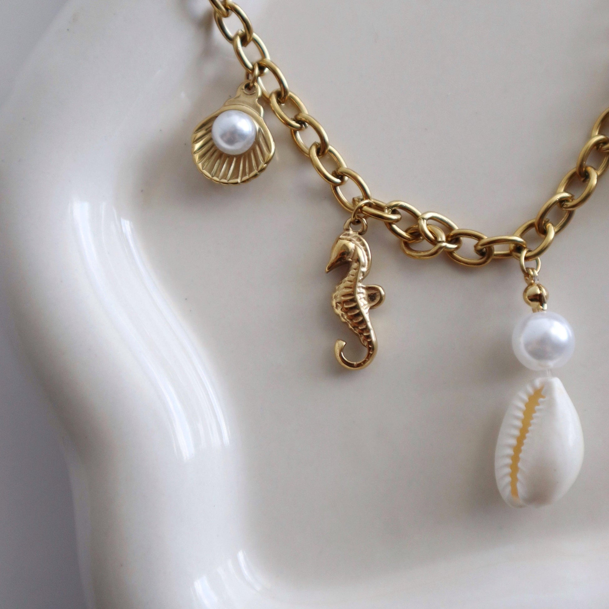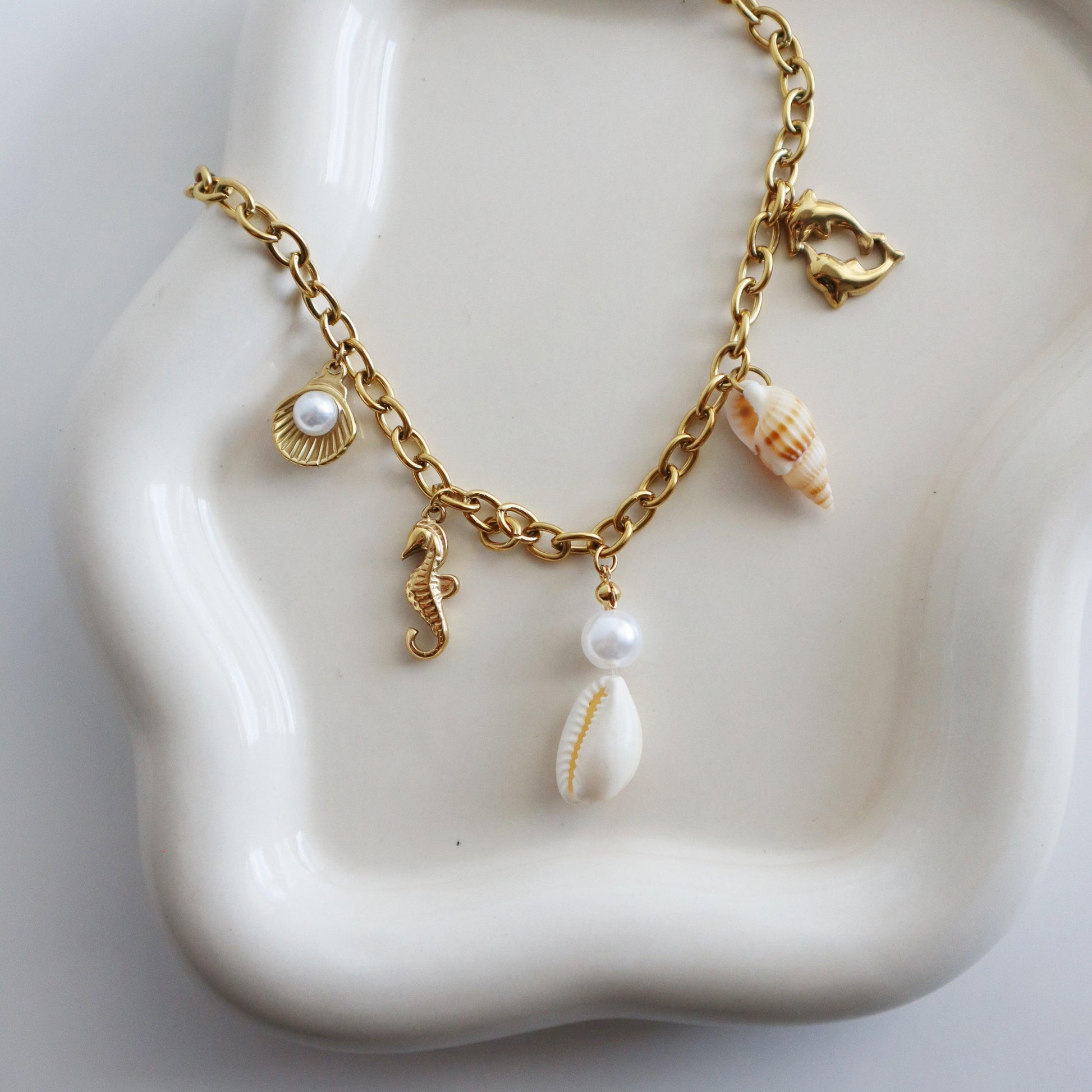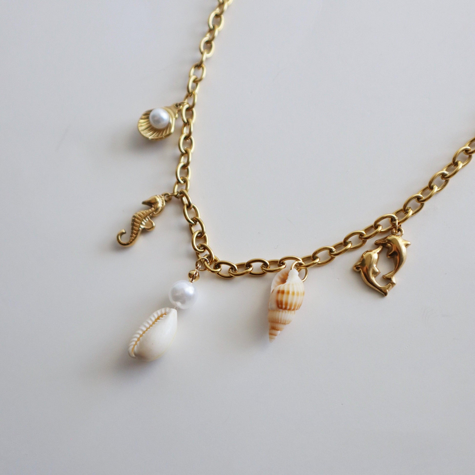 Indulge in the essence of summertime with our Coastal Beach Charm Necklace. This stunning charm necklace features five beachy charms (imitation shells), perfect for any beach lover.