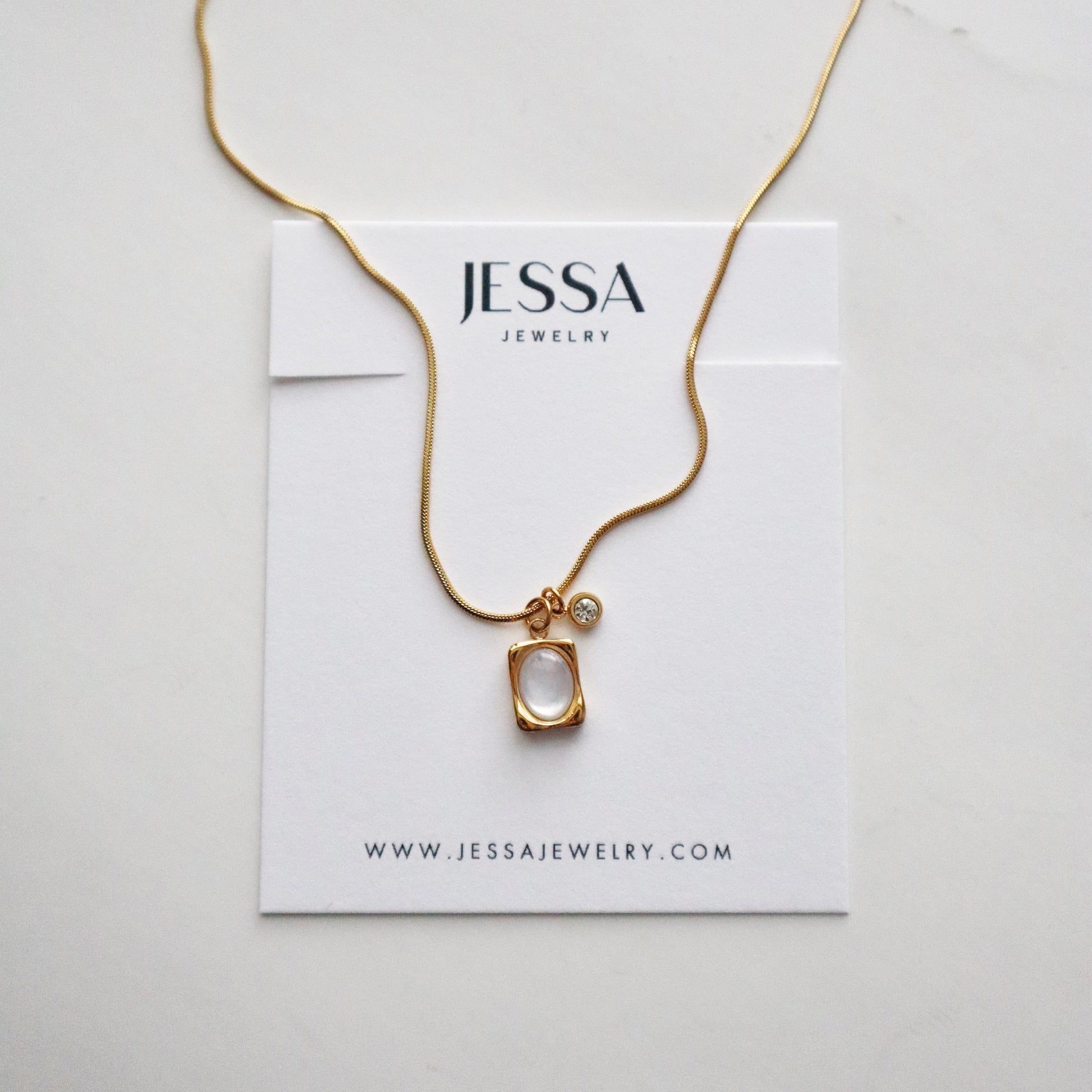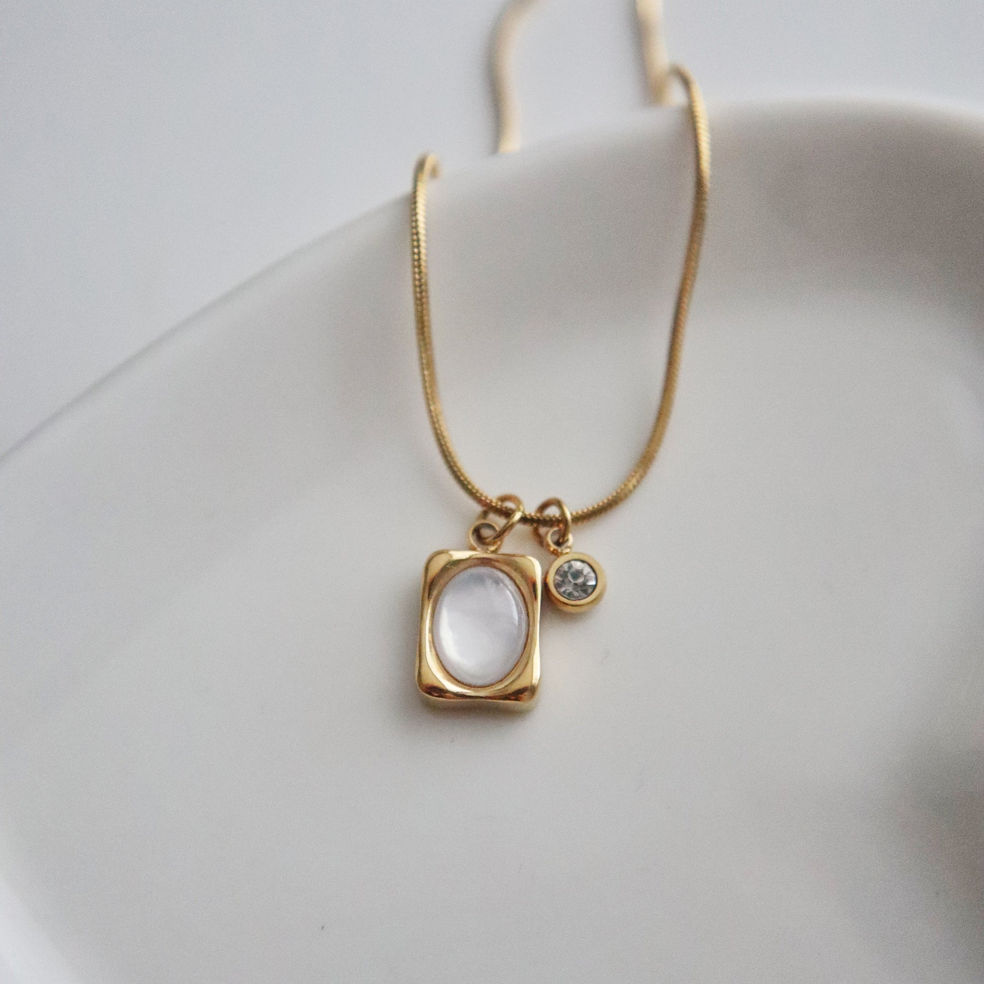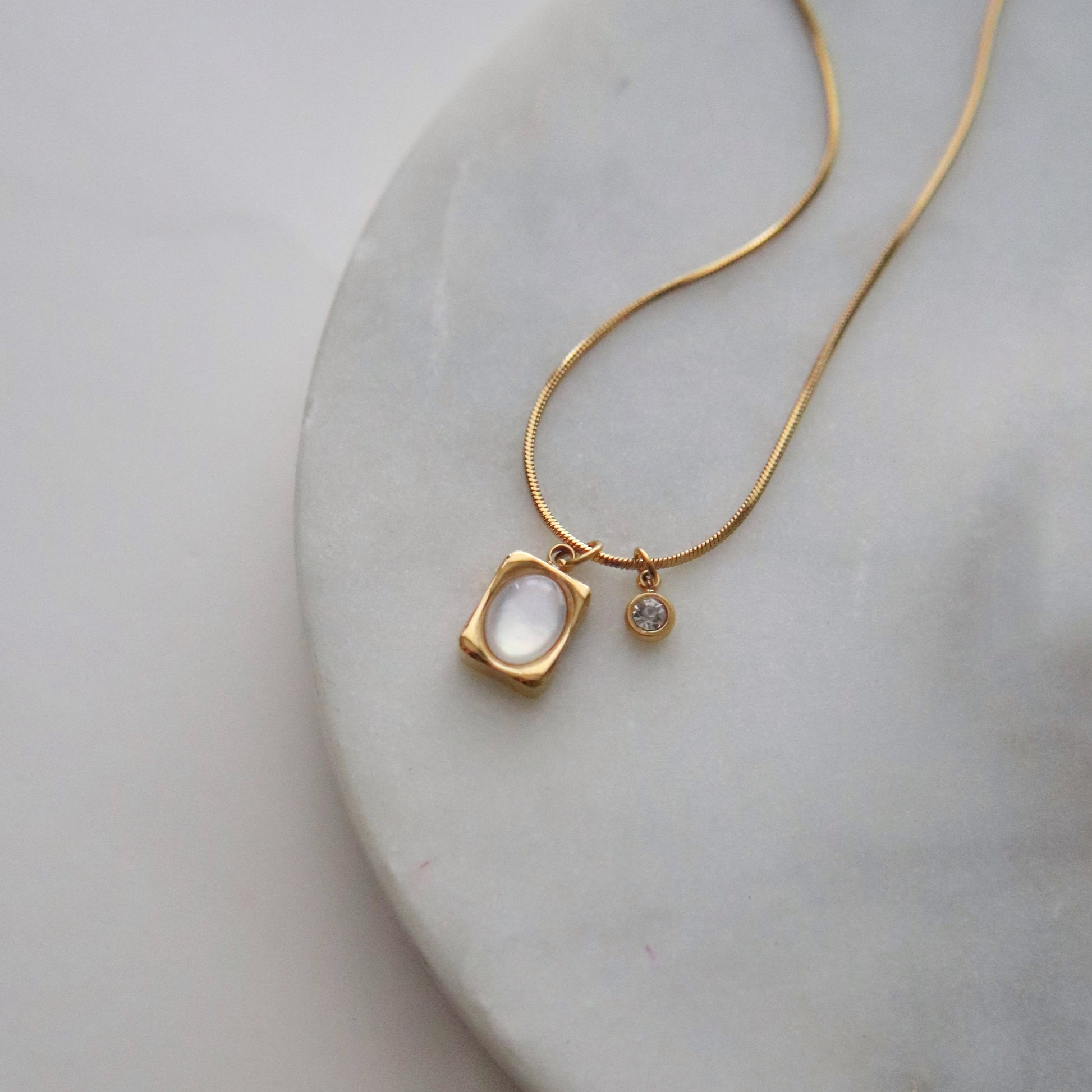 The Ivory Grace Necklace features a luminous stone set in a rectangular gold pendant, paired with a delicate CZ charm that adds just the right touch of sparkle. Perfect for everyday moments.