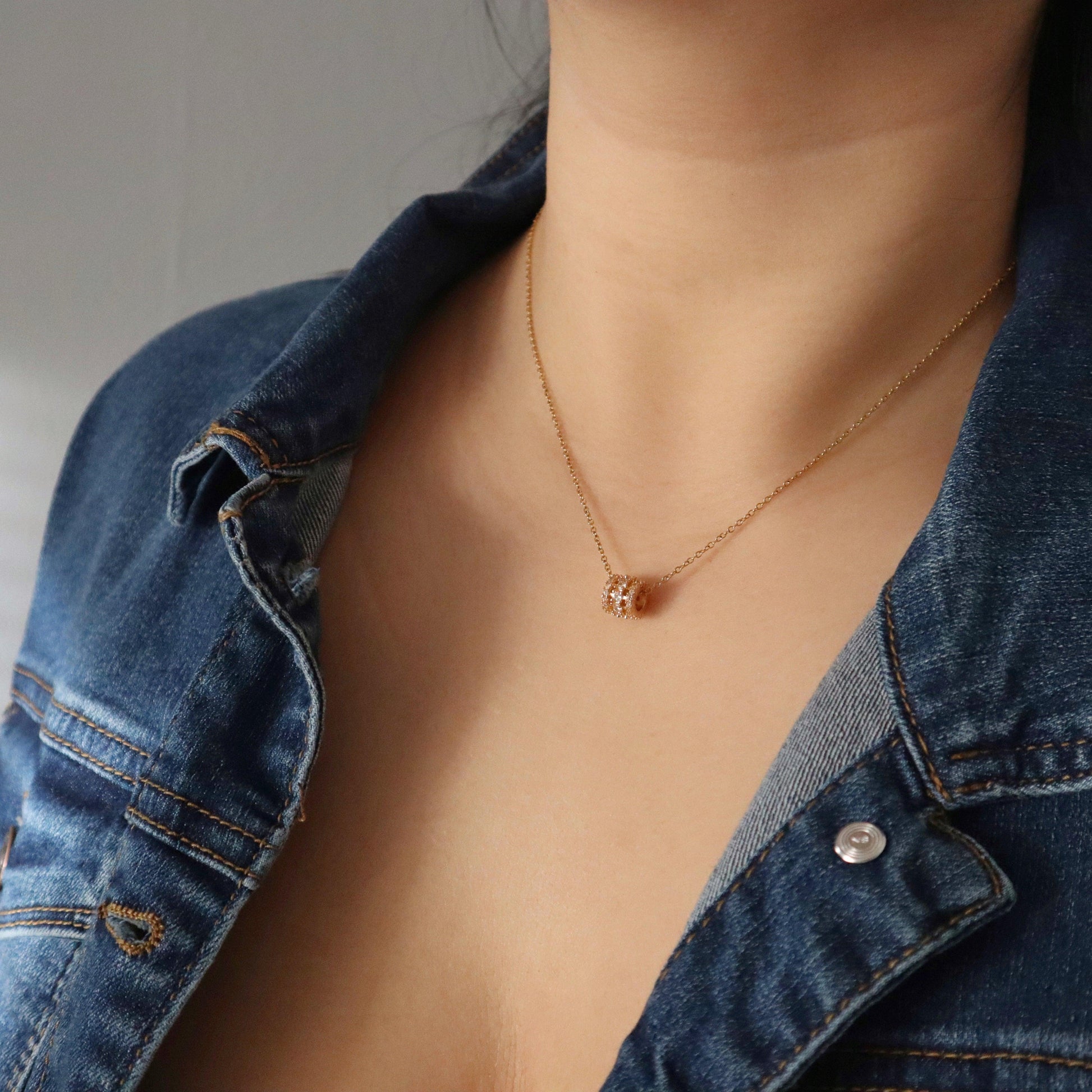 This stunning gold necklace features a beautifully designed barrel-shaped pendant, adorned with three rows of sparkling stones that catch the light from every angle.