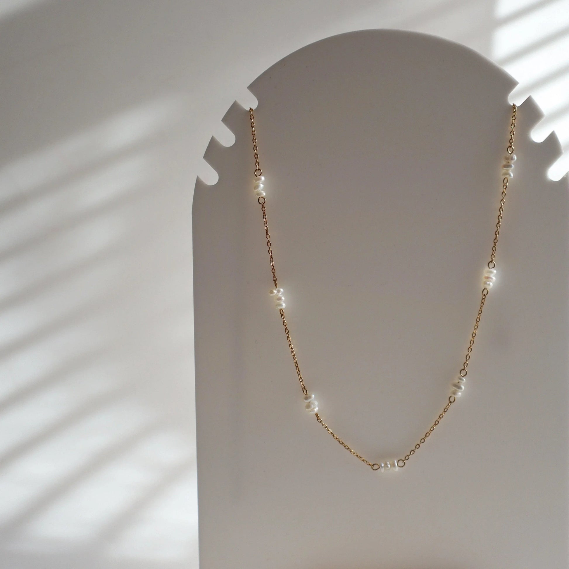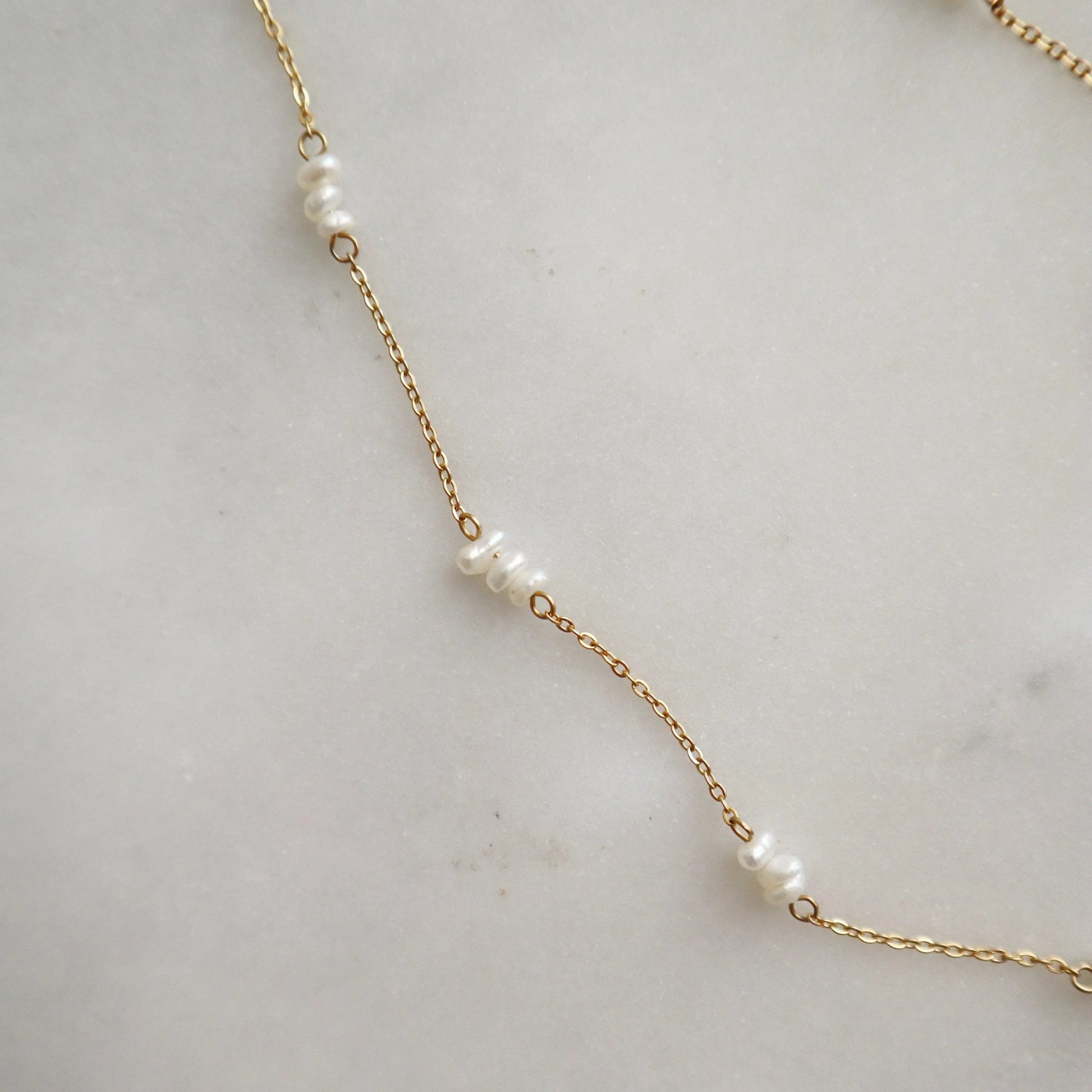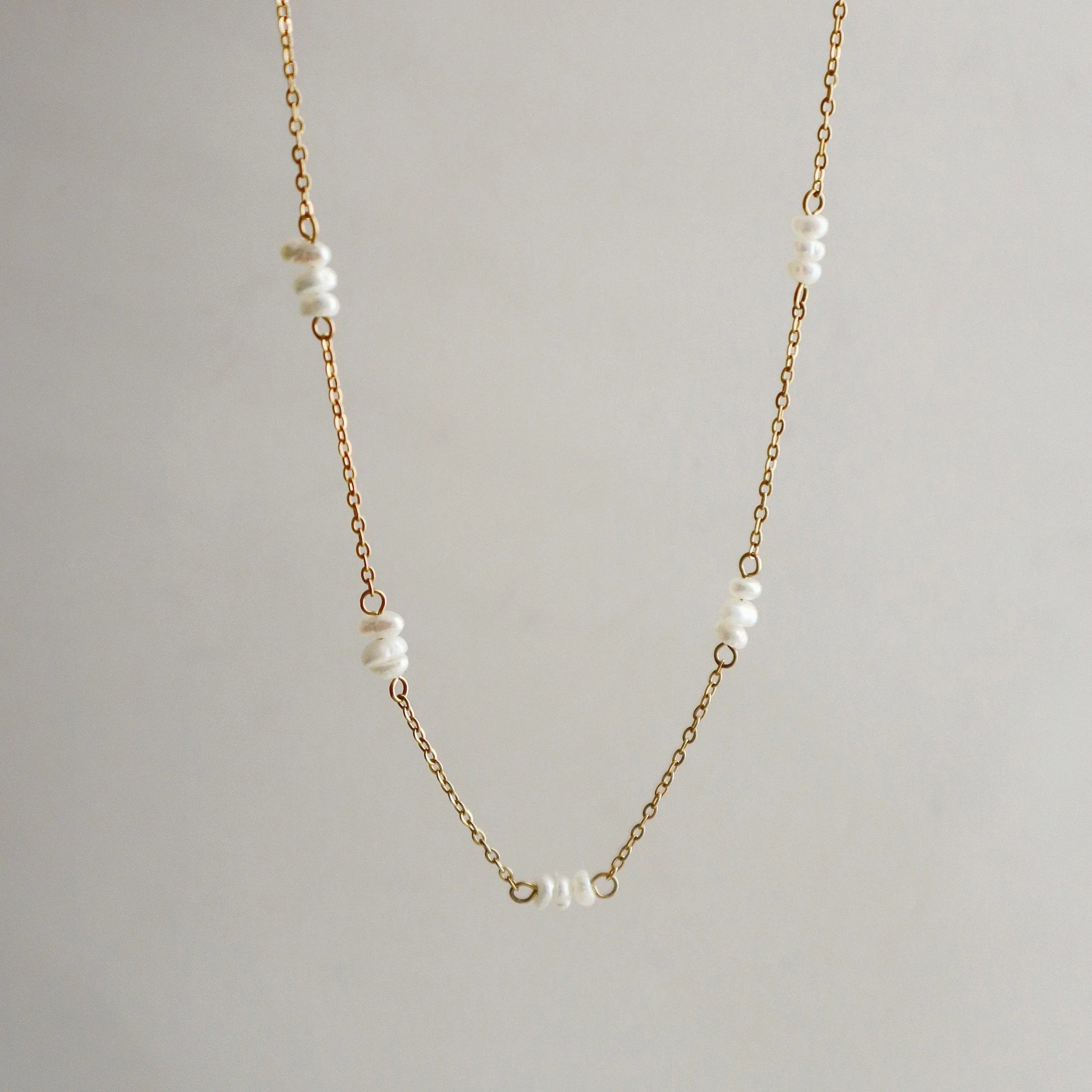 The Talia Pearl Necklace features a delicate 18k gold plated chain, beautifully accented with clusters of dainty pearls spaced evenly along the chain. Whether worn alone for a subtle statement or layered for a trendy look, the Talia Necklace is a must-have for any pearl lover.