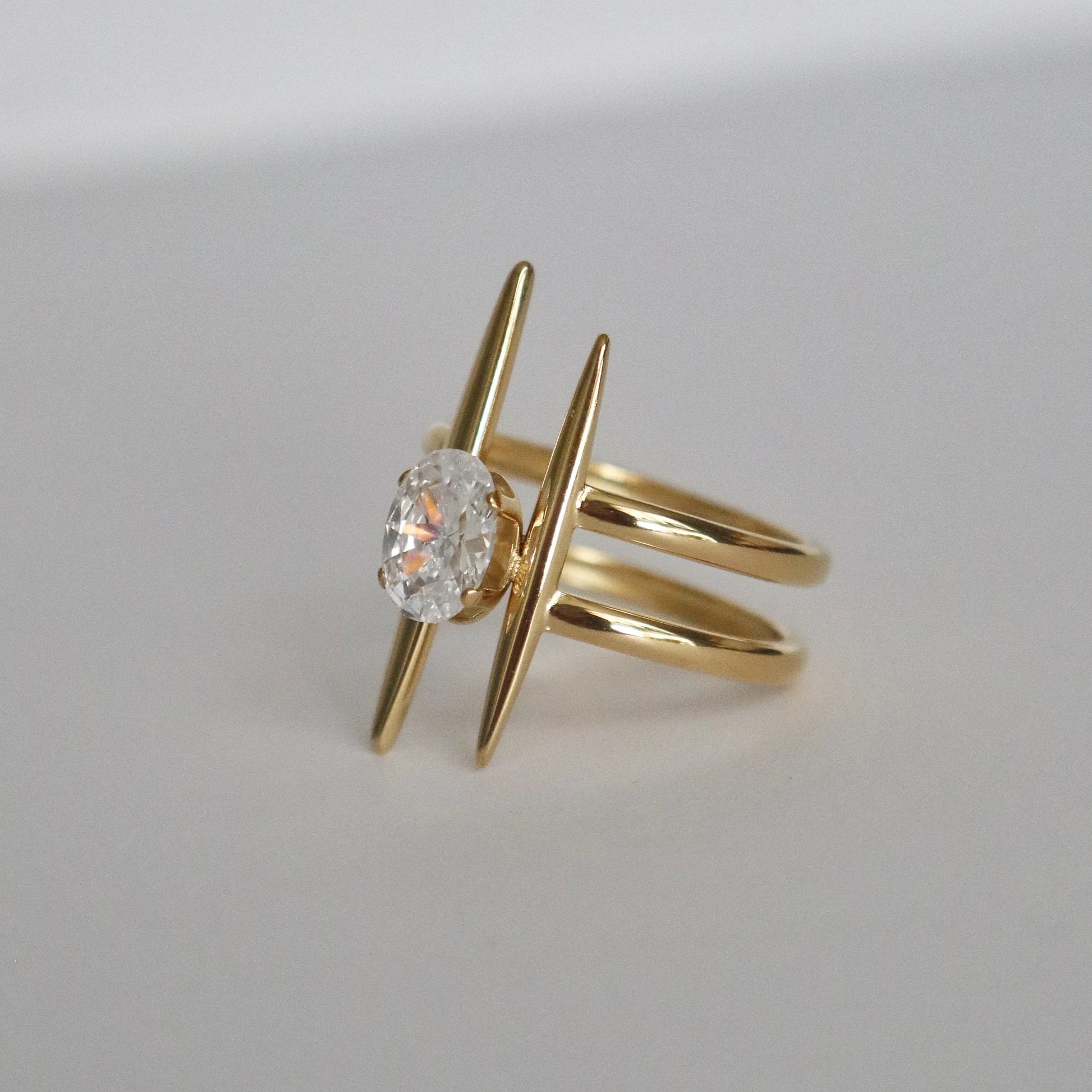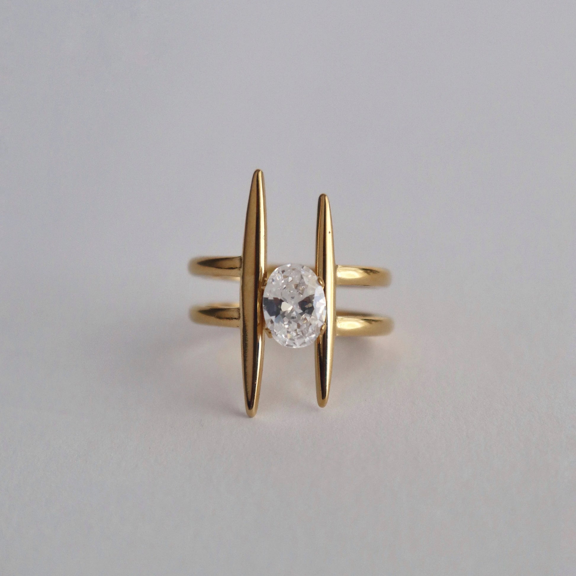 This ring features a striking double-bar design that frames an oval cut zirconia stone. Hypoallergenic and water-resistant, it’s made to be your everyday statement.