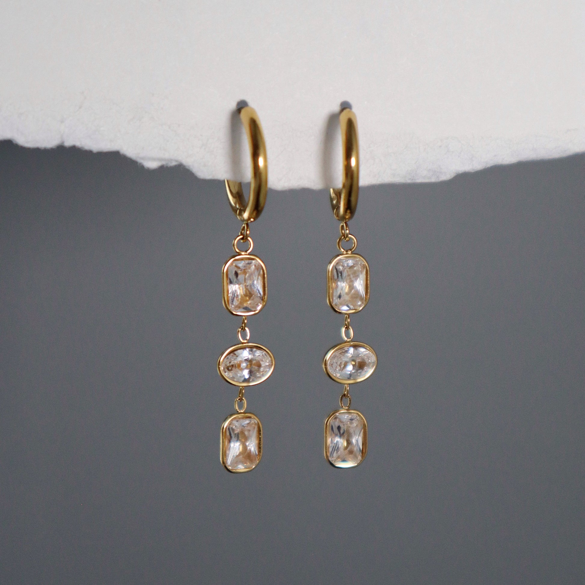 Add a little elegance and sparkle to your look with these beautiful hoop earrings that feature a delicate dangle of three zircon stones. Their graceful design makes them the perfect statement piece while still feeling lightweight and easy to wear.