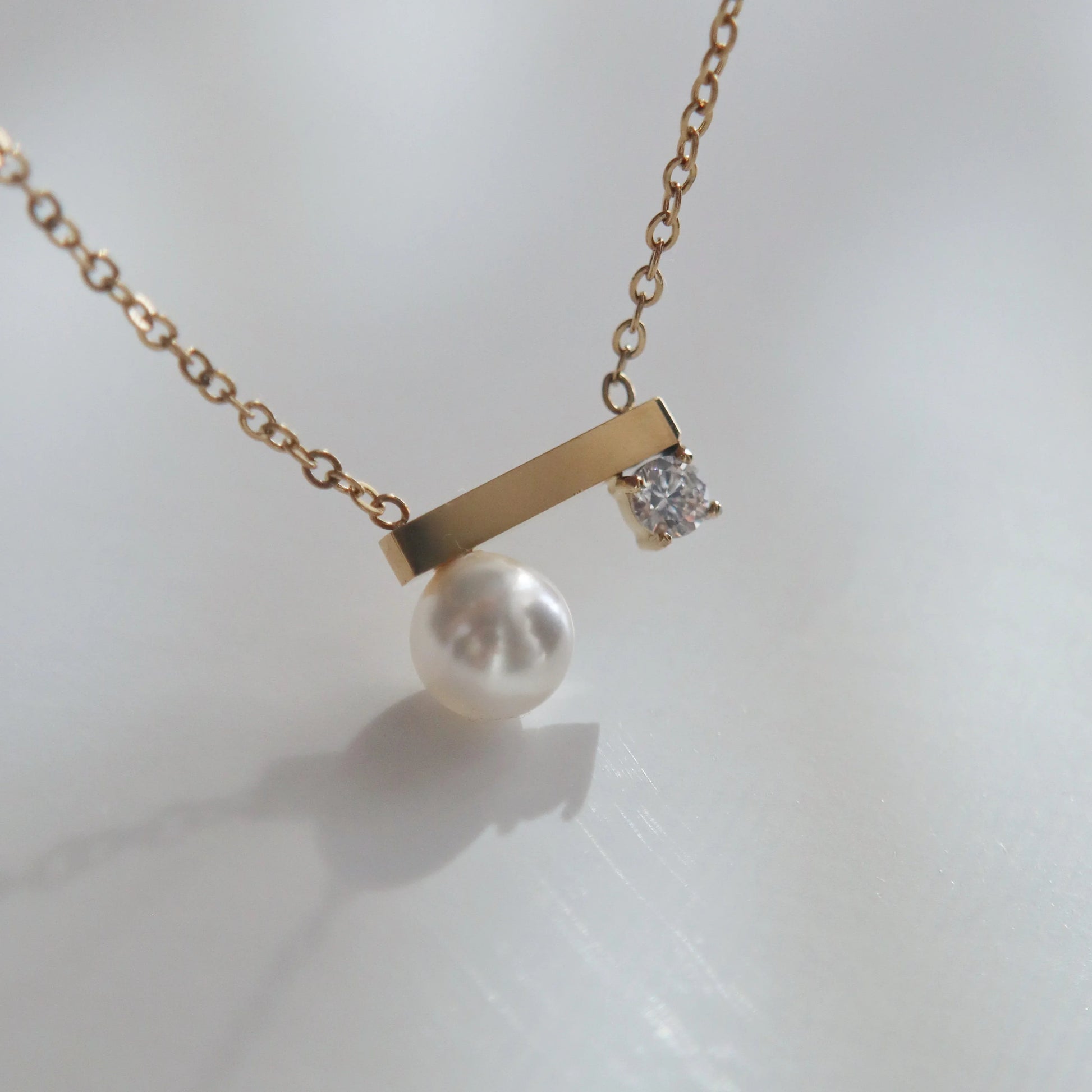 Our Pearl and CZ Bar Necklace - a delicate bar pendant featuring a single pearl and a tiny cubic zirconia—simple, soft, and effortlessly feminine. This dainty piece adds a touch of charm and glow to your everyday layers.