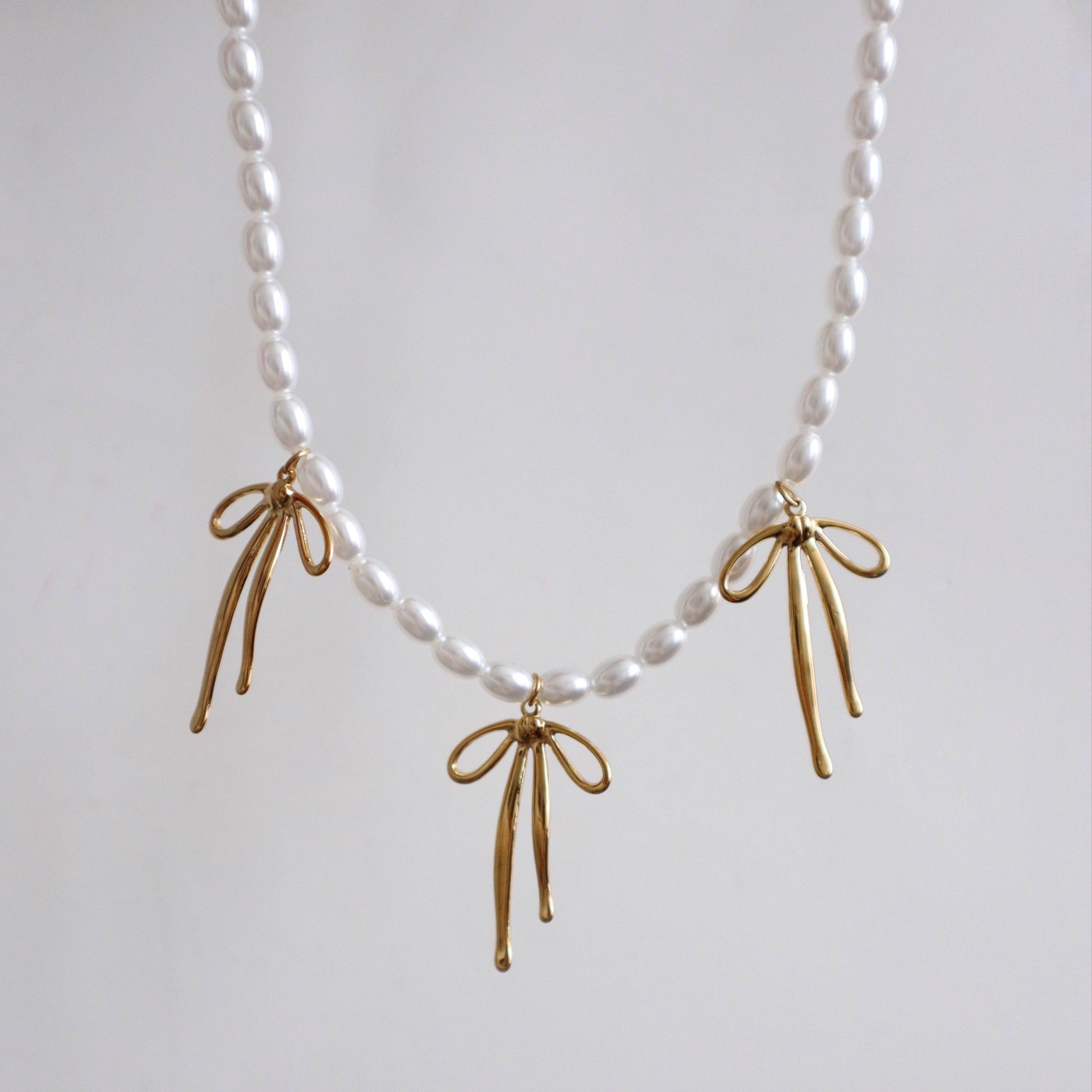 Timeless and sophisticated, this elegant pearl necklace features three delicate bows, adding a touch of grace to a classic necklace design. This pearl necklace is a modern twist, perfect for special occasions or elevating your everyday look