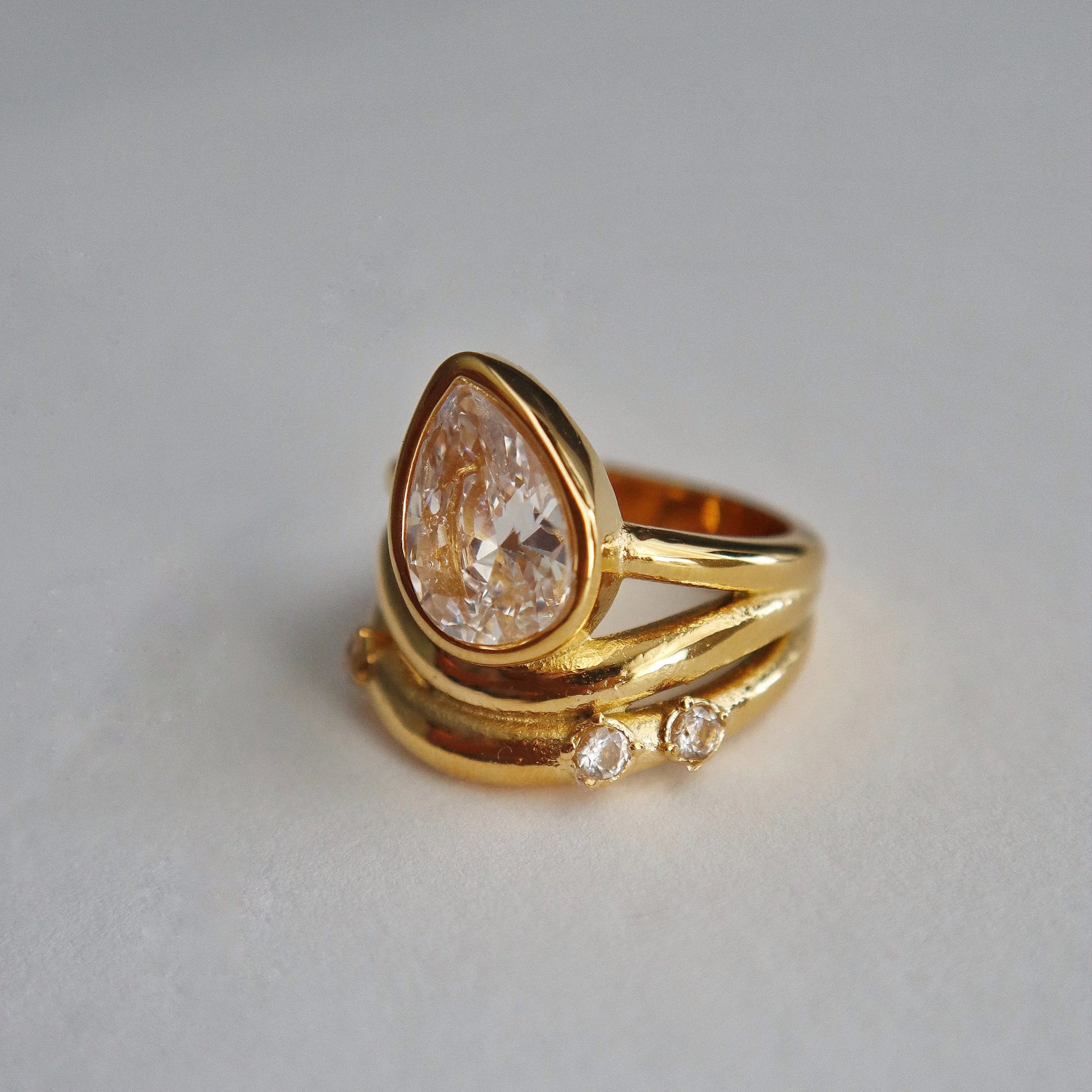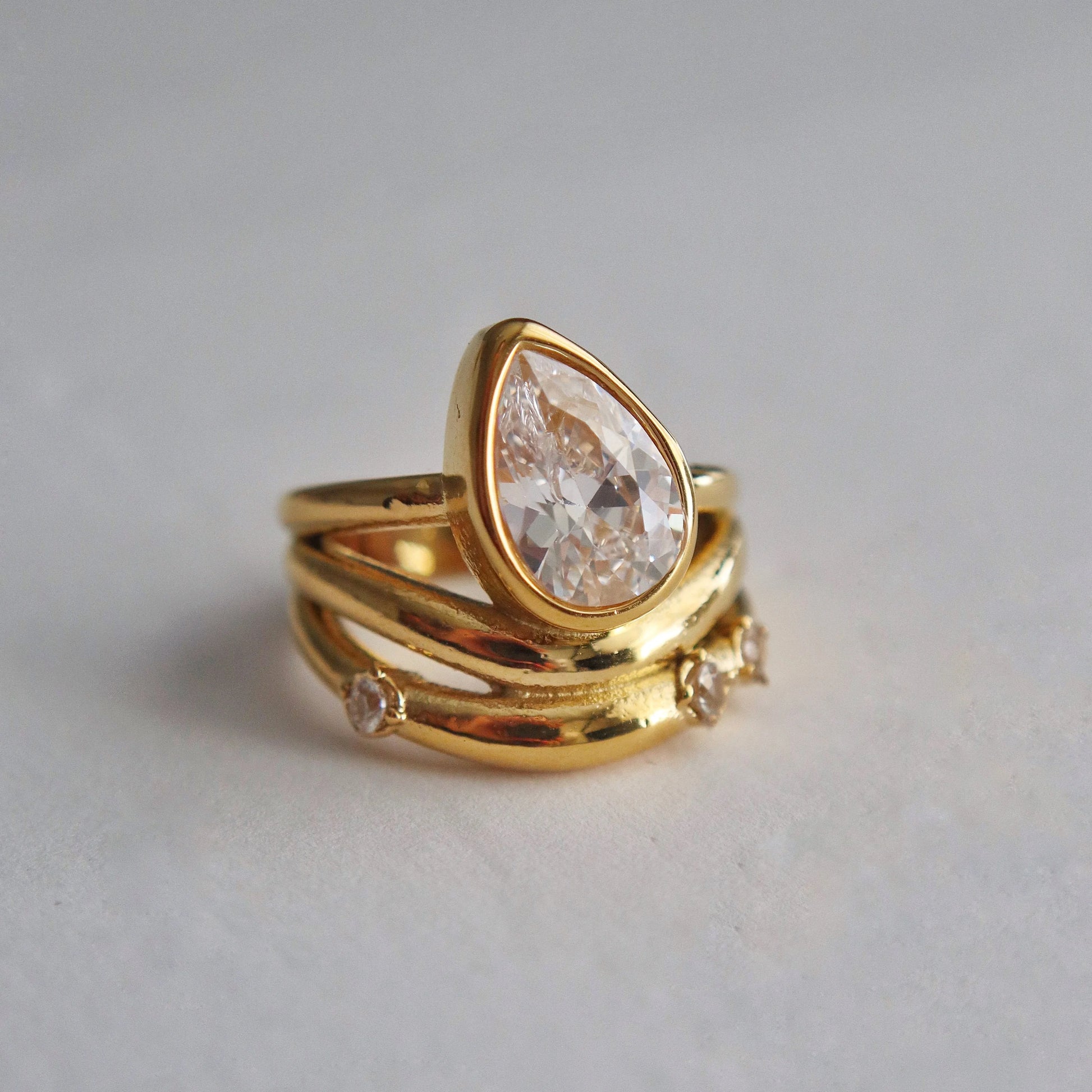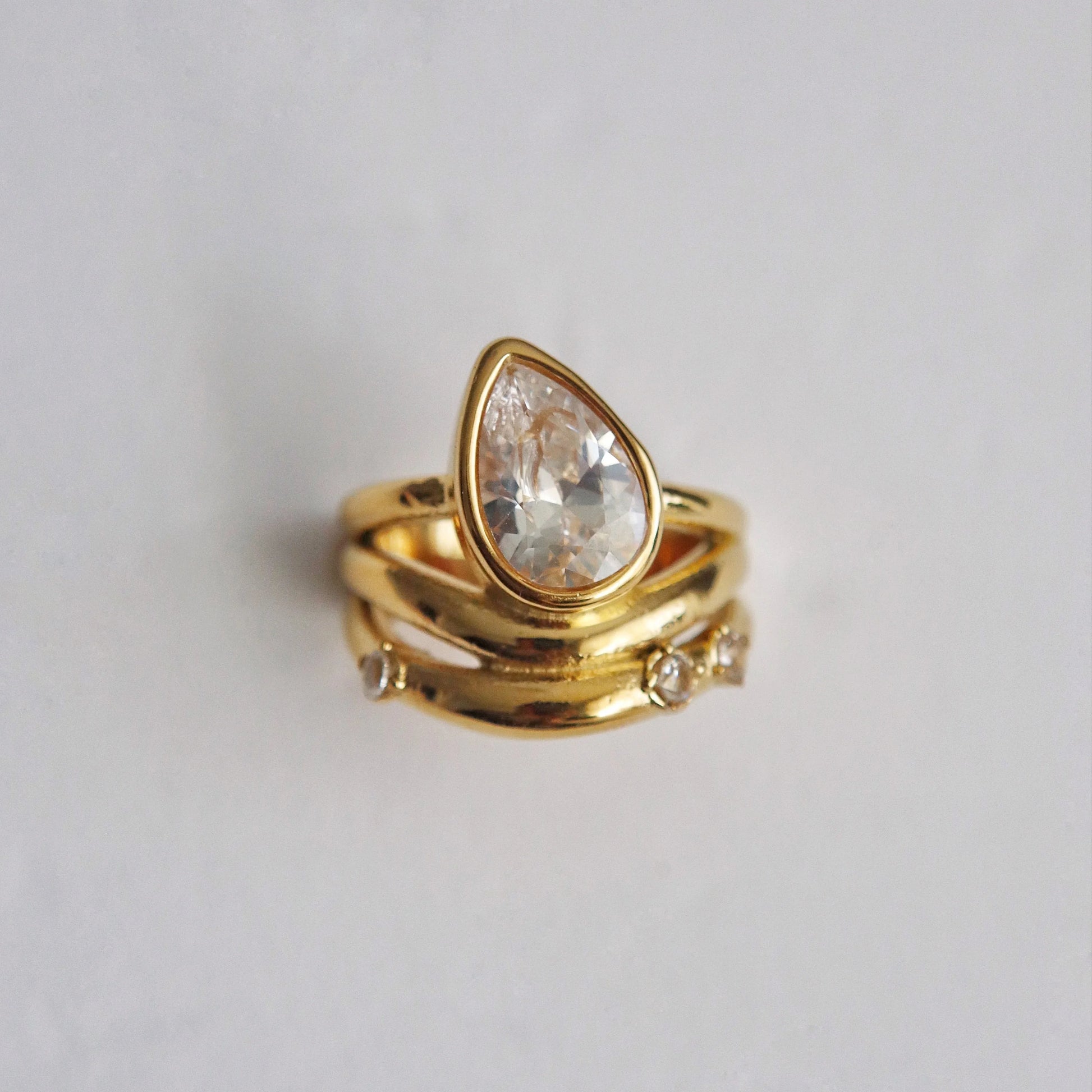 Why stack when one ring does it all? This beauty gives the illusion of three gold bands layered to perfection. Featuring a bold pear-cut zirconia stone at the center and three mini round CZ stones along sculpted gold bands. Make a statement with the Sol Ring.