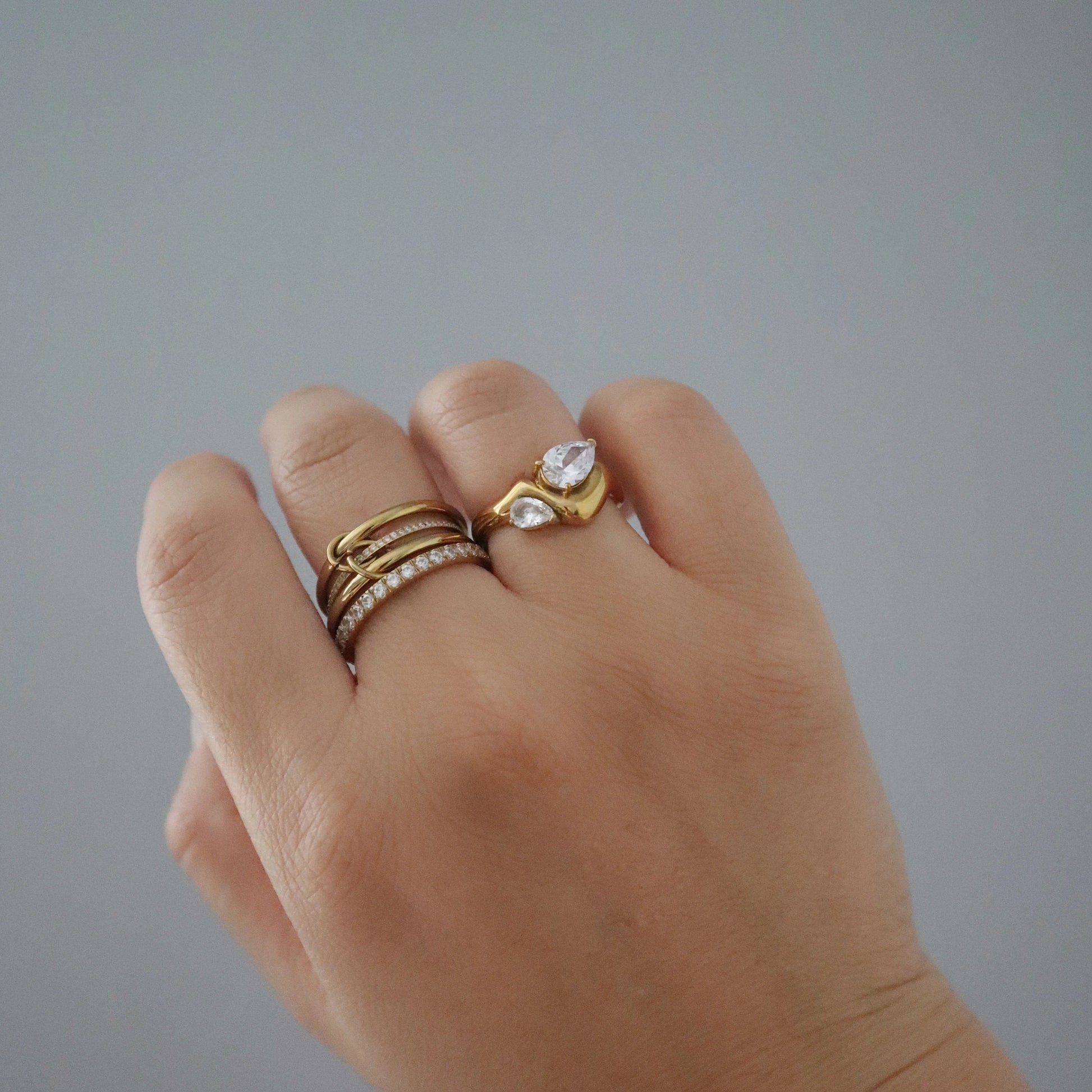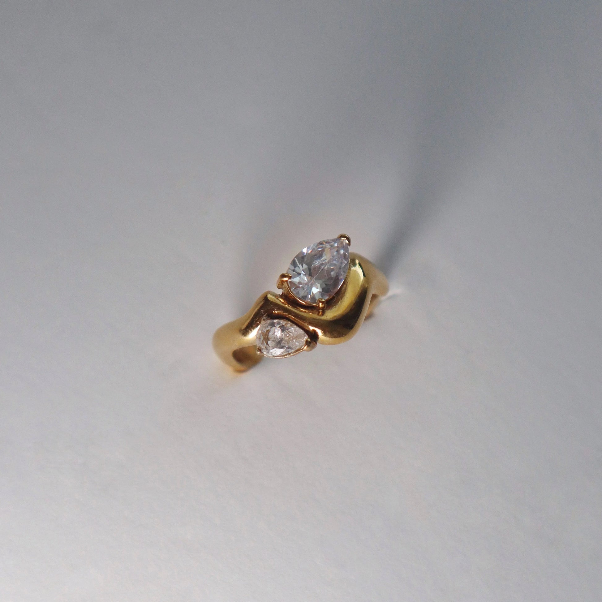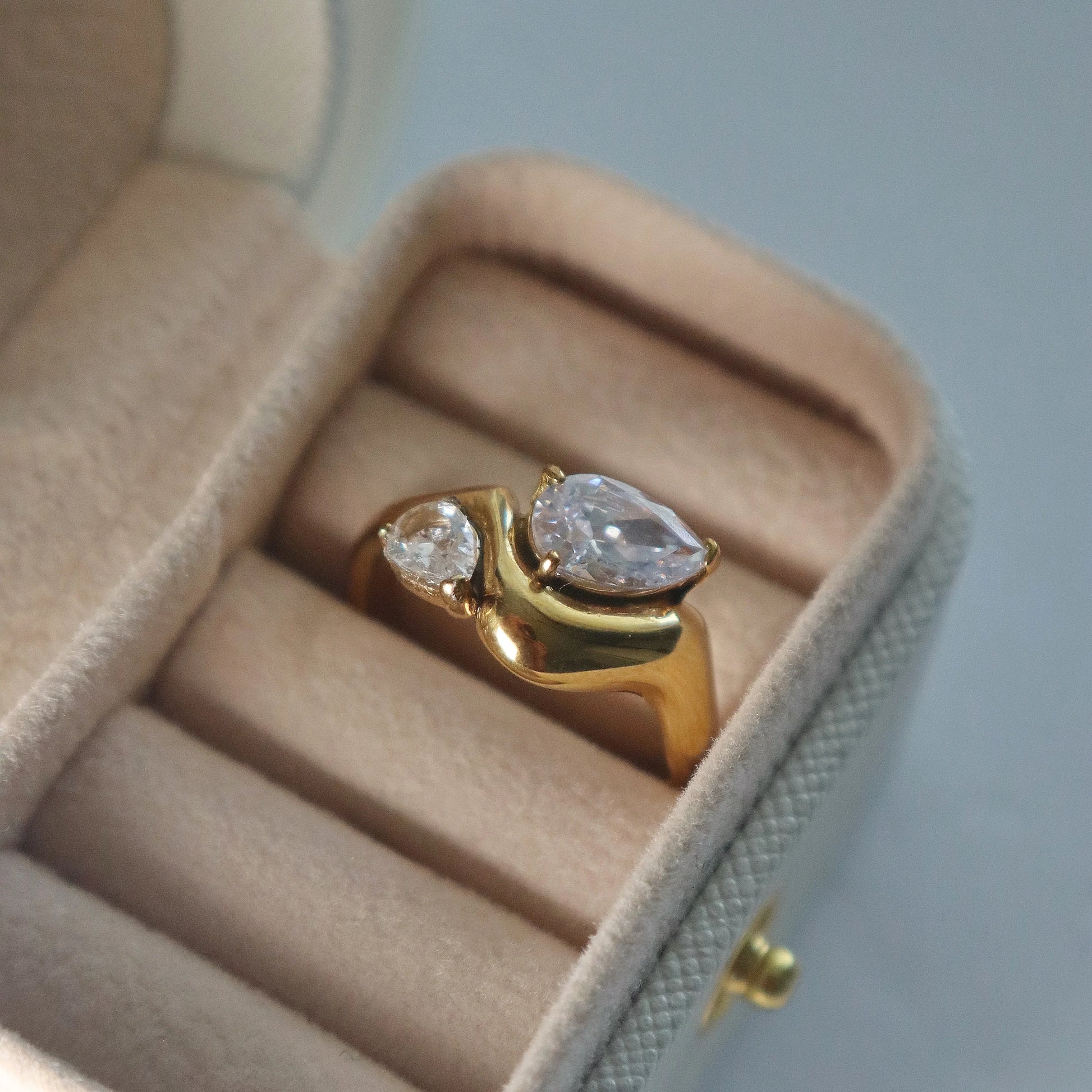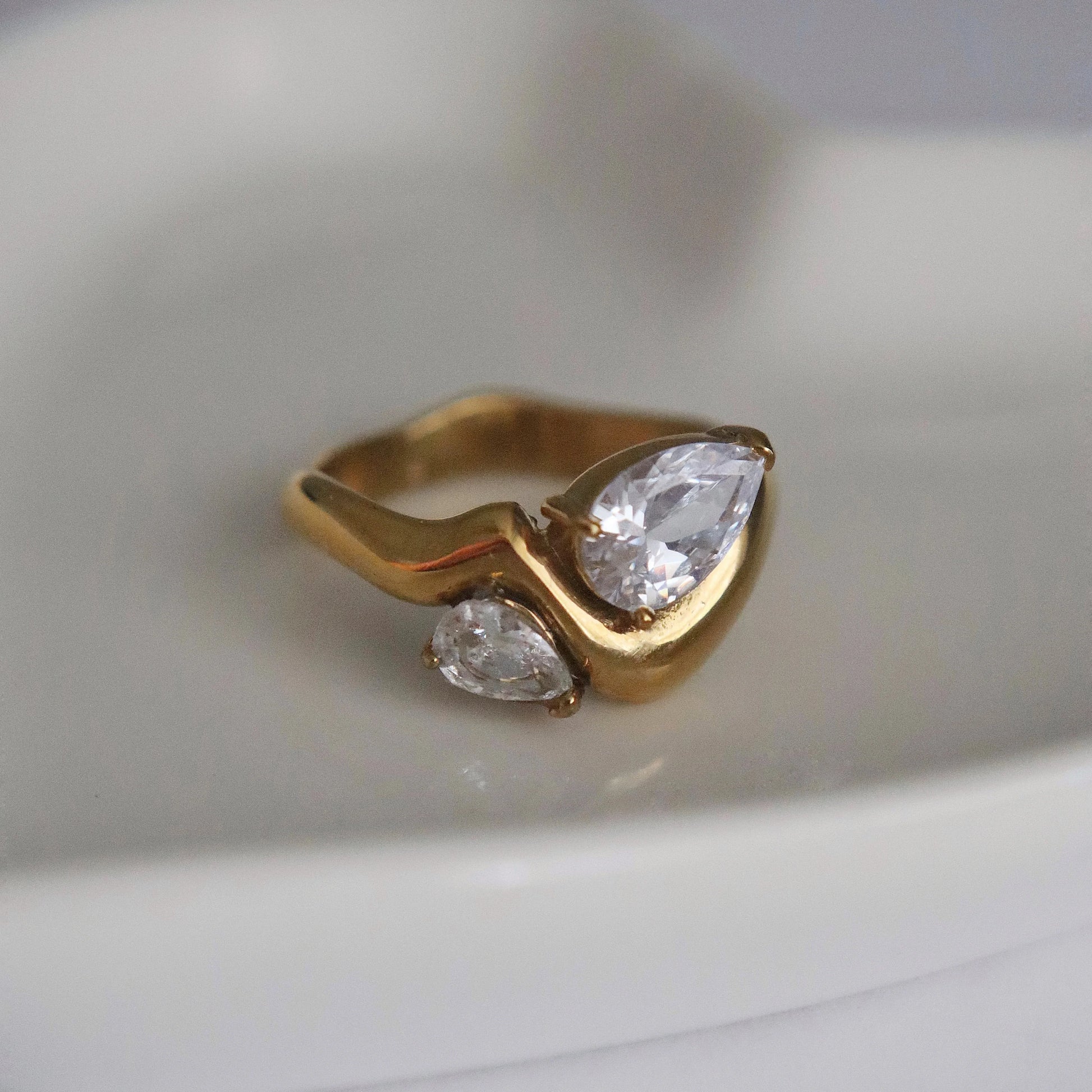 Turn heads with this bold and elegant Teardrop Duo Ring. Featuring two dazzling teardrop-shaded stones set in a fluid, wavy gold band, this piece exudes modern sophistication with a touch of glam. Whether you're dressing up or elevating your everyday style, this ring brings the perfect amount of sparkle and uniqueness to your look.
