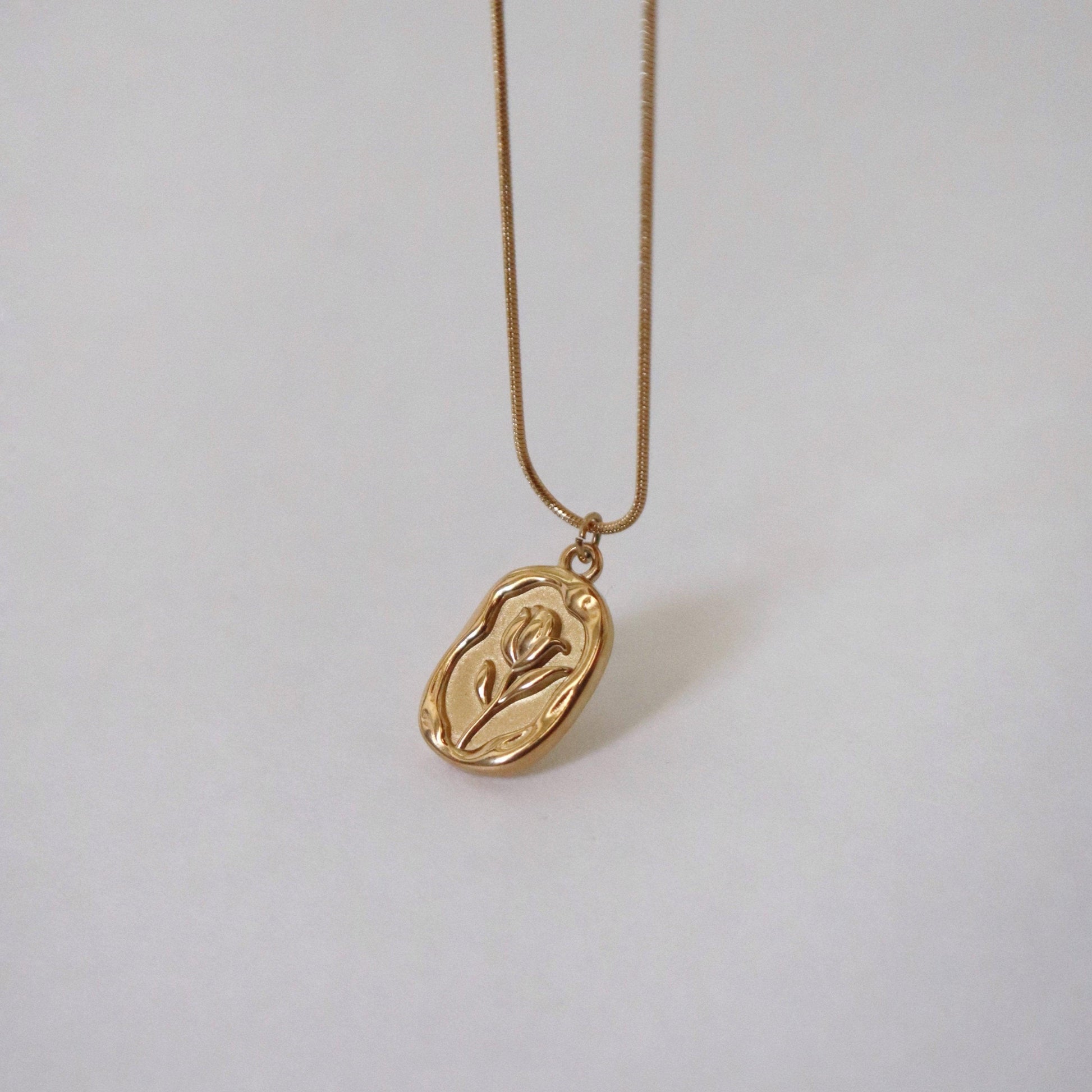 Indulge in the timeless beauty of our Tulip Necklace. Featuring a thin snake chain and a delicate flower pendant, this necklace add a feminine touch to any ensemble.